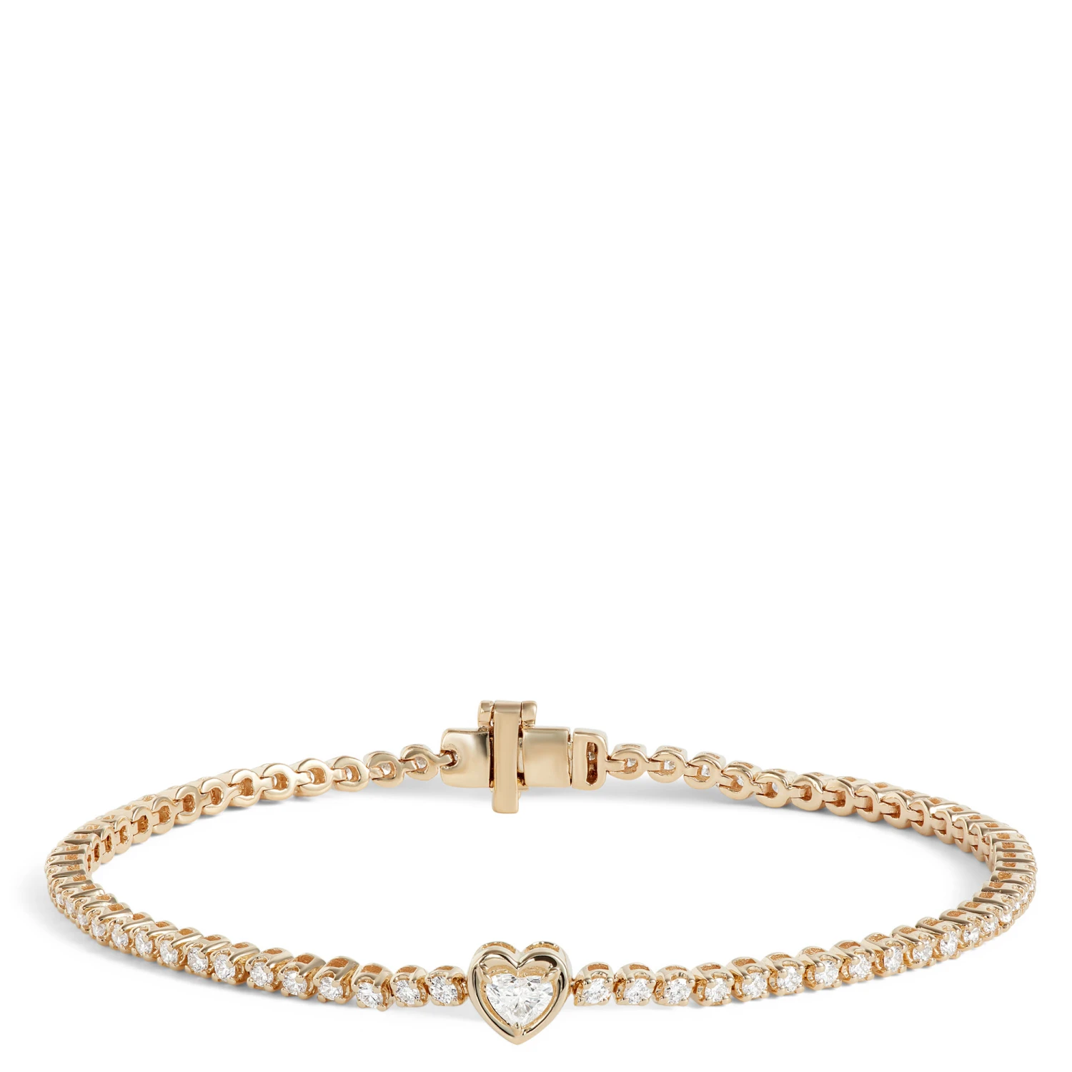 A string of beautiful round diamonds track toward a showstopping center diamond in a heart shaped bezel setting of 14k yellow gold. This piece has all the elegant allure of a classic tennis bracelet with just the right touches to make it truly special. This stunning heirloom-quality bracelet is made with natural, responsibly sourced gemstones because jewelry that’s made with love is made to love for a lifetime
