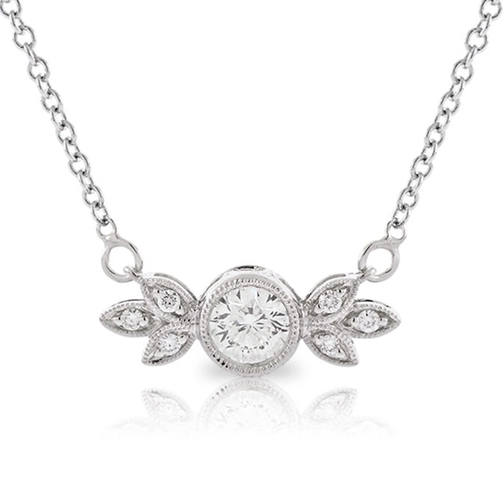 A Ben Bridge Signature Diamond sits at the center in a bezel set design. Milgrain detailing and additional non-Signature diamonds in a three leaf pattern add extra sparkle to an already stunning neck piece. Chain can be adjusted to either 18 or 16 inches for versatile wear.