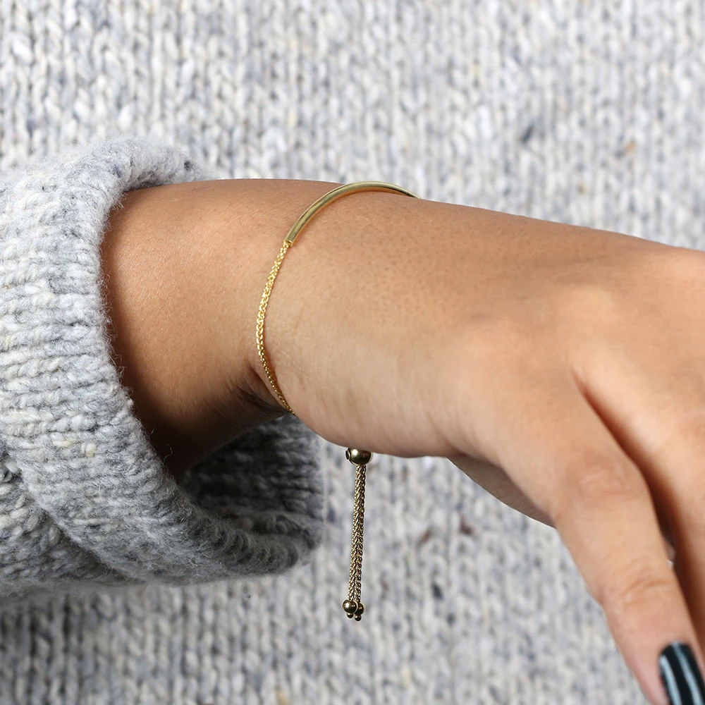 When you want clean simple elegance for your wrist, this is the bolo bracelet for you. It’s a simple gold bar that fits from 9.25 inches to however snug you want to go. Easy to get on and off with no clasp to slow you down.