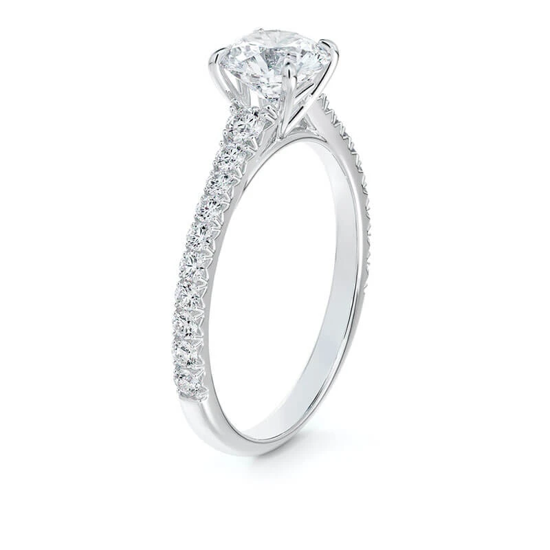 Expertly crafted with a diamond comfort band which flawlessly arches into the basket to host a round Forevermark diamond center.