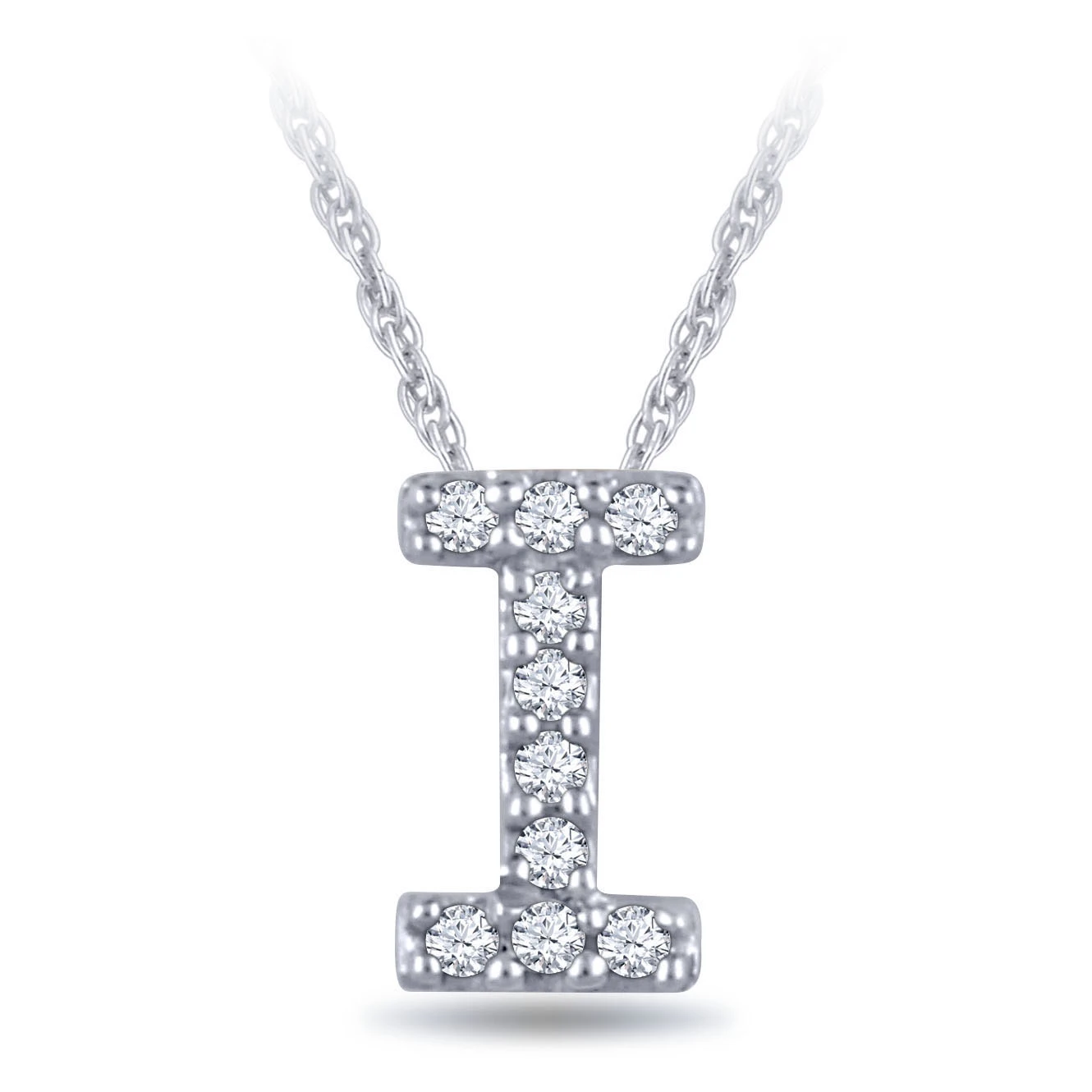 Diamond initial pendant letter “I” in white gold. The letter is approximately 1/4 inch tall, and includes a delicate 18″ chain, adjustable to 16″. It’s a great way to celebrate yourself or give a thoughtful gift to someone else.