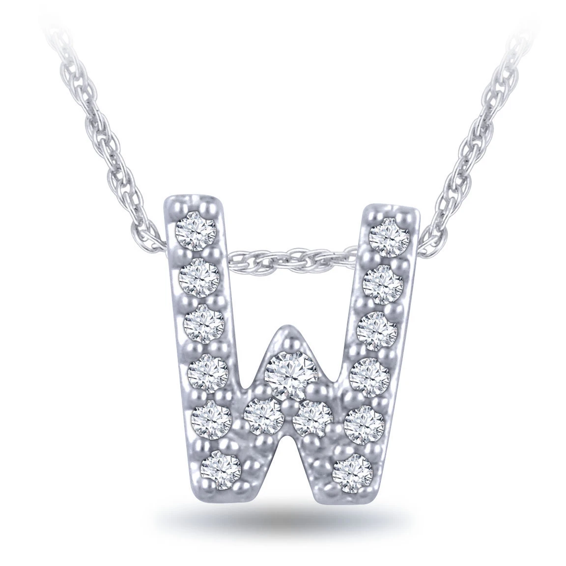 Diamond initial pendant letter “W” in white gold. The letter is approximately 1/4 inch tall, and includes a delicate 18″ chain, adjustable to 16″. It’s a great way to celebrate yourself or give a thoughtful gift to someone else.