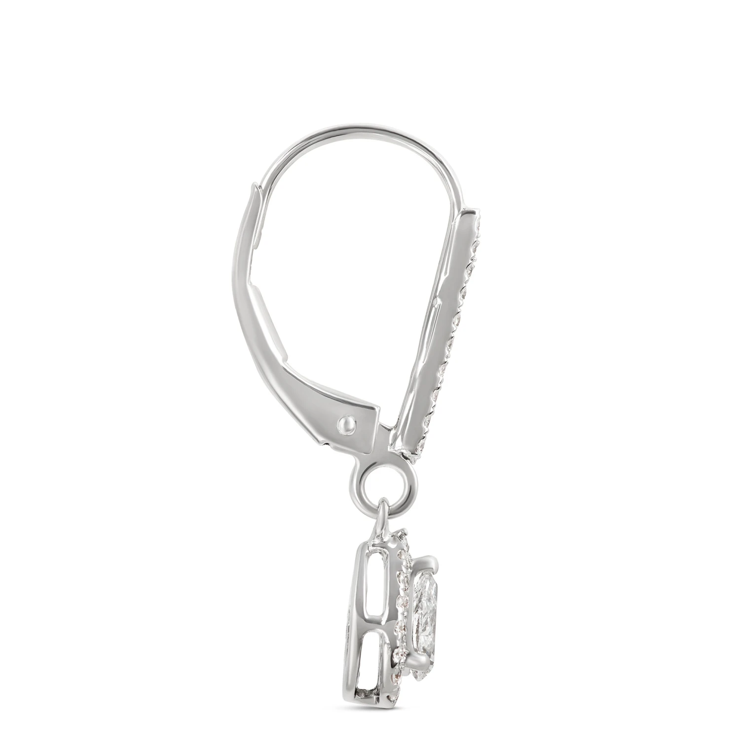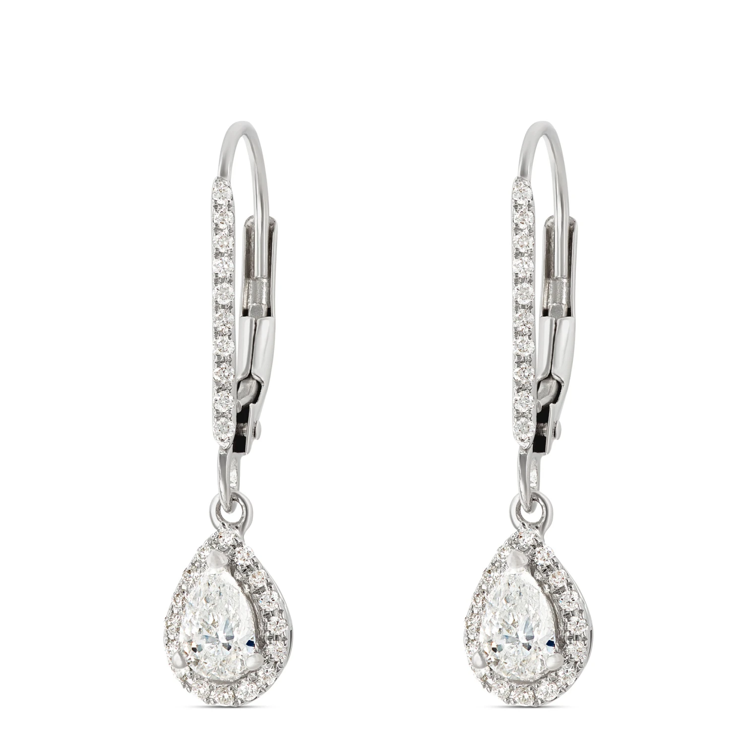 Sleek, sophisticated and endlessly enchanting, these leverback earrings showcase a captivating pear diamond centerpiece surrounded by a sparkling halo of round cut diamonds. White gold is the perfect complement to the light-catching glow of exceptionally cut, polished and hand-selected diamonds.