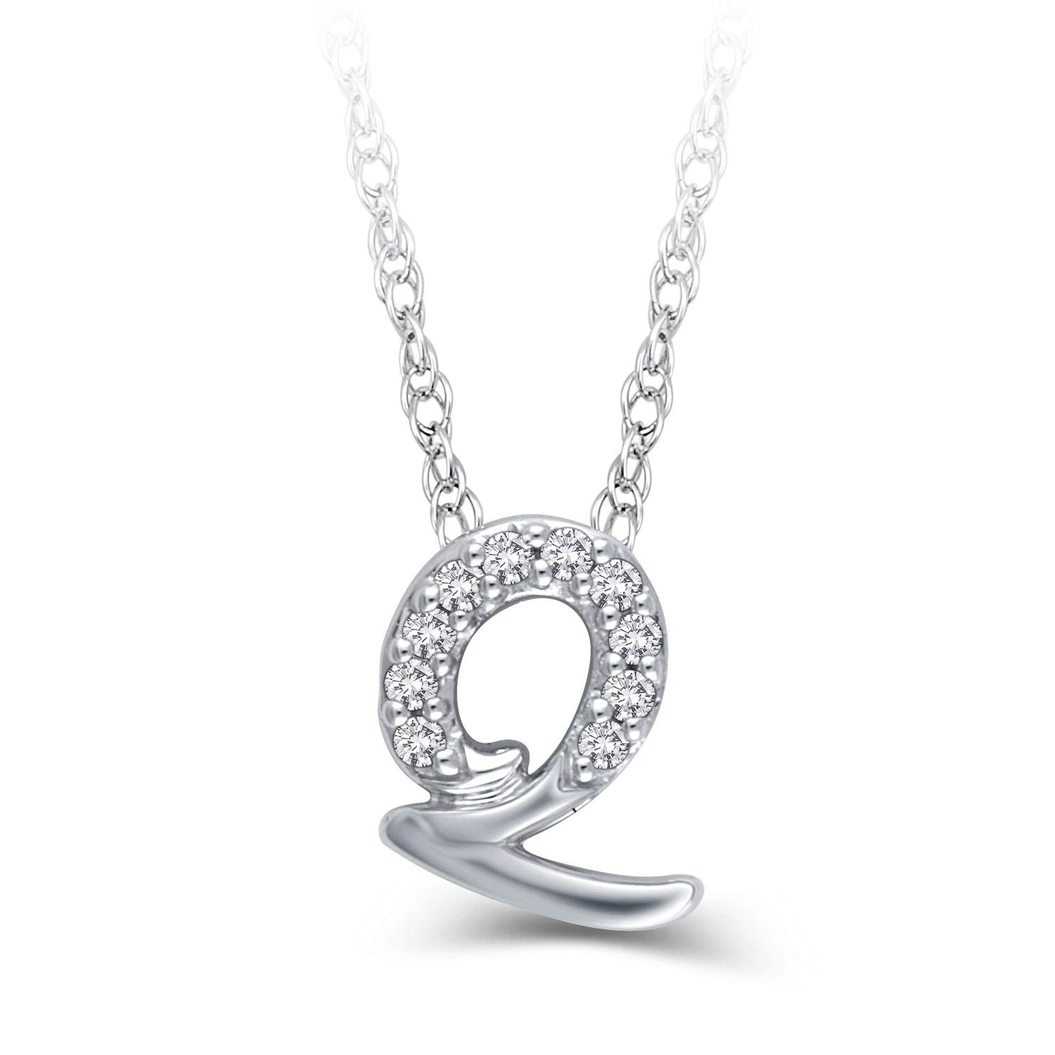 Sparkly stylized diamond initial pendant letter โQโ in white gold script. The letter is more than 1/4 inch high, and a great way to personalize your style. Necklace is 18 inches with a 2 inch shortening loop.