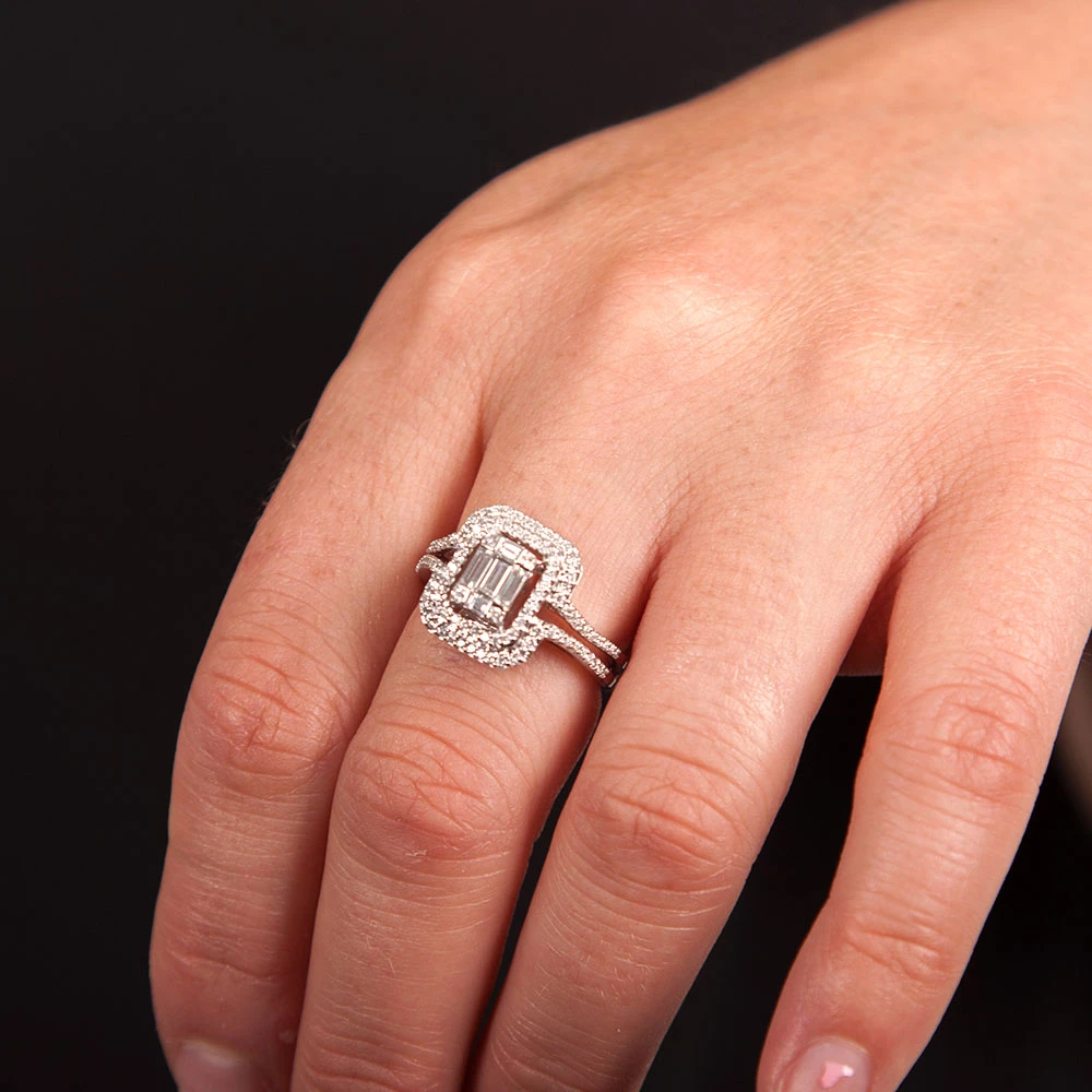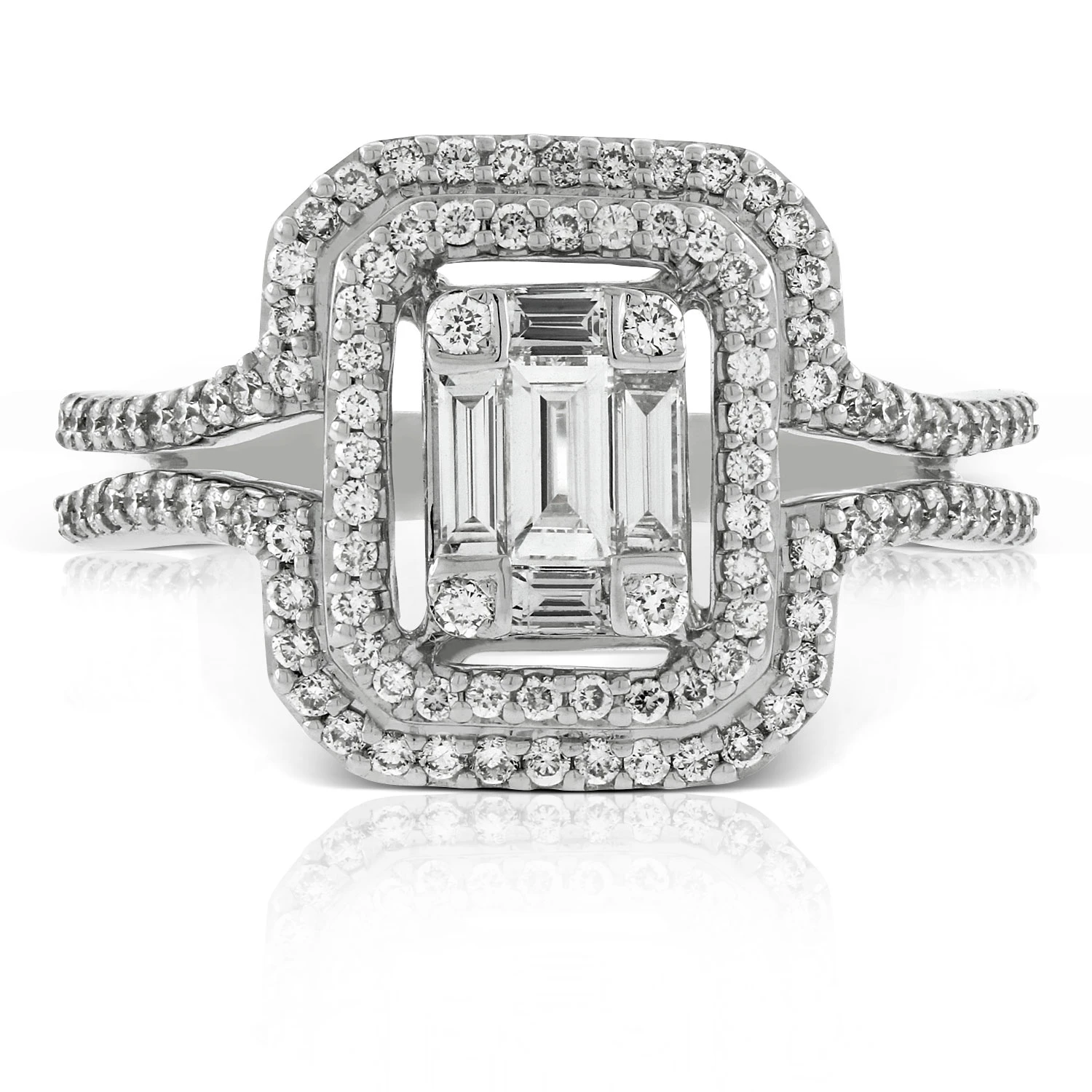 Featuring a center portion of baguette and round cut diamonds, this double halo ring provides a stunning look in a split shank design. Suitable for an engagement ring , equally beautiful as a dazzling fashion ring for the right hand. Matching pendant is 11445871, earrings are 11685211