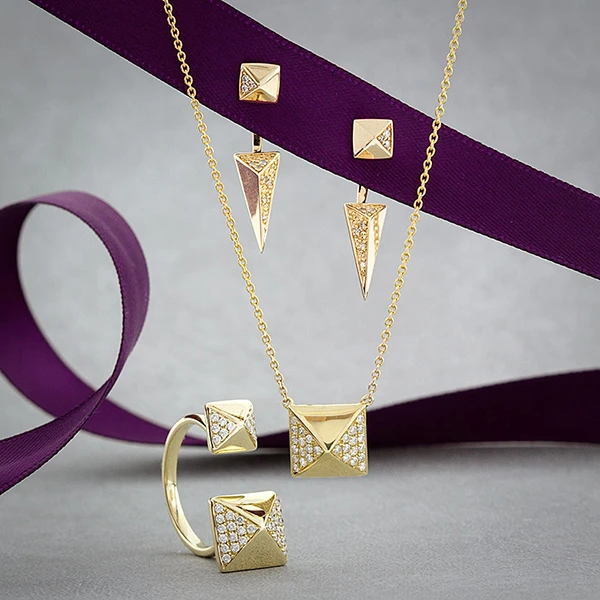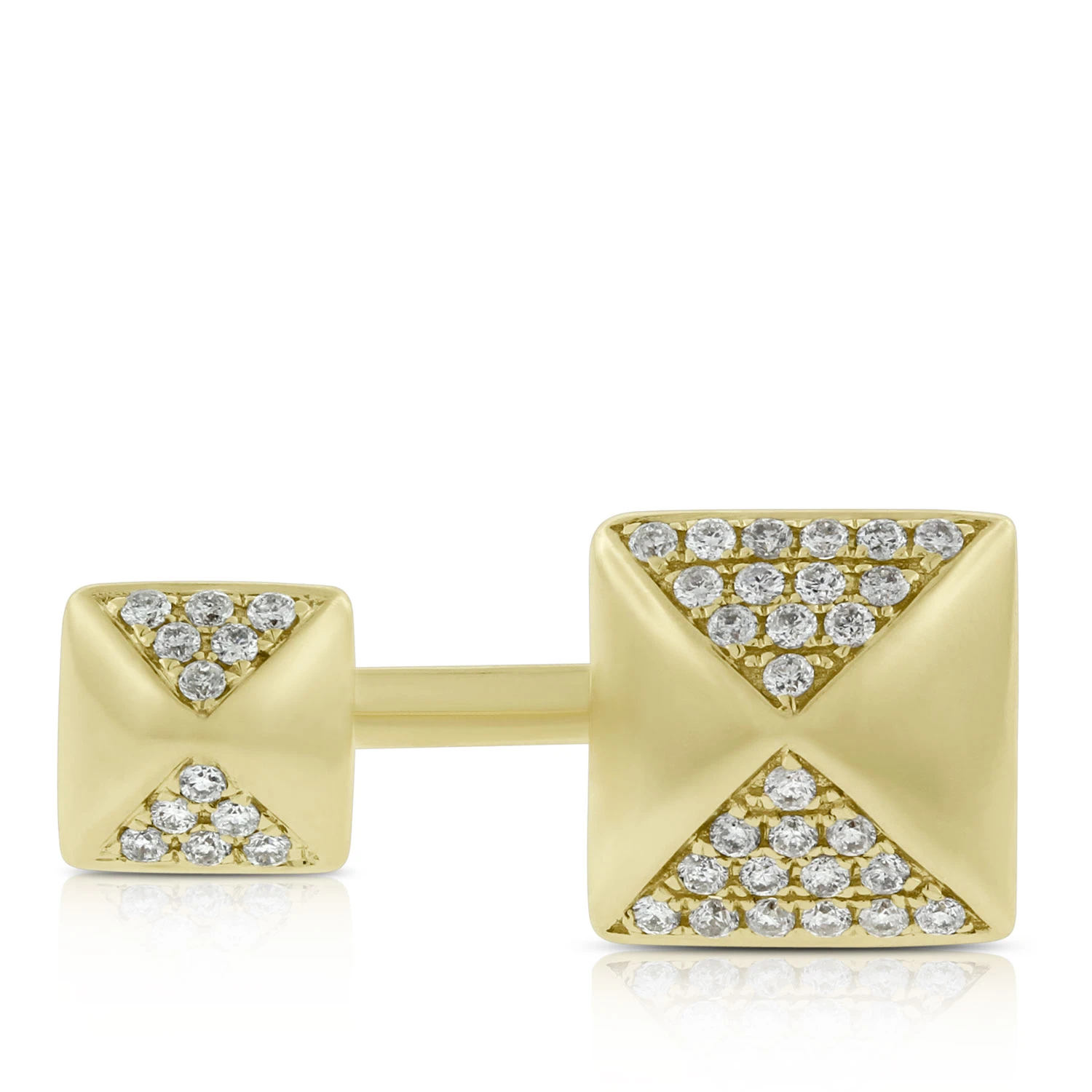 Double diamond pyramid ring in 14K yellow gold. Highly polished yellow gold alternates with pavé set diamonds for a glamourous geometric statement with edge. Diamonds equal 1/4 carat total weight, stack with gold and diamond bands for a layered look or wear solo to showcase your unique style.