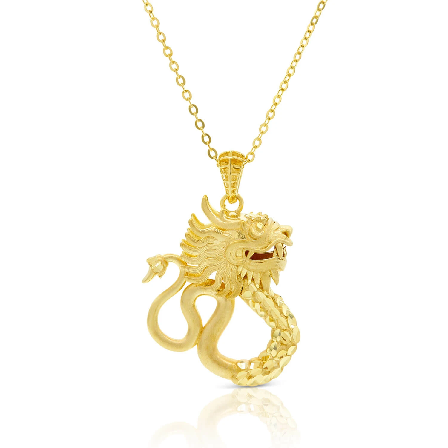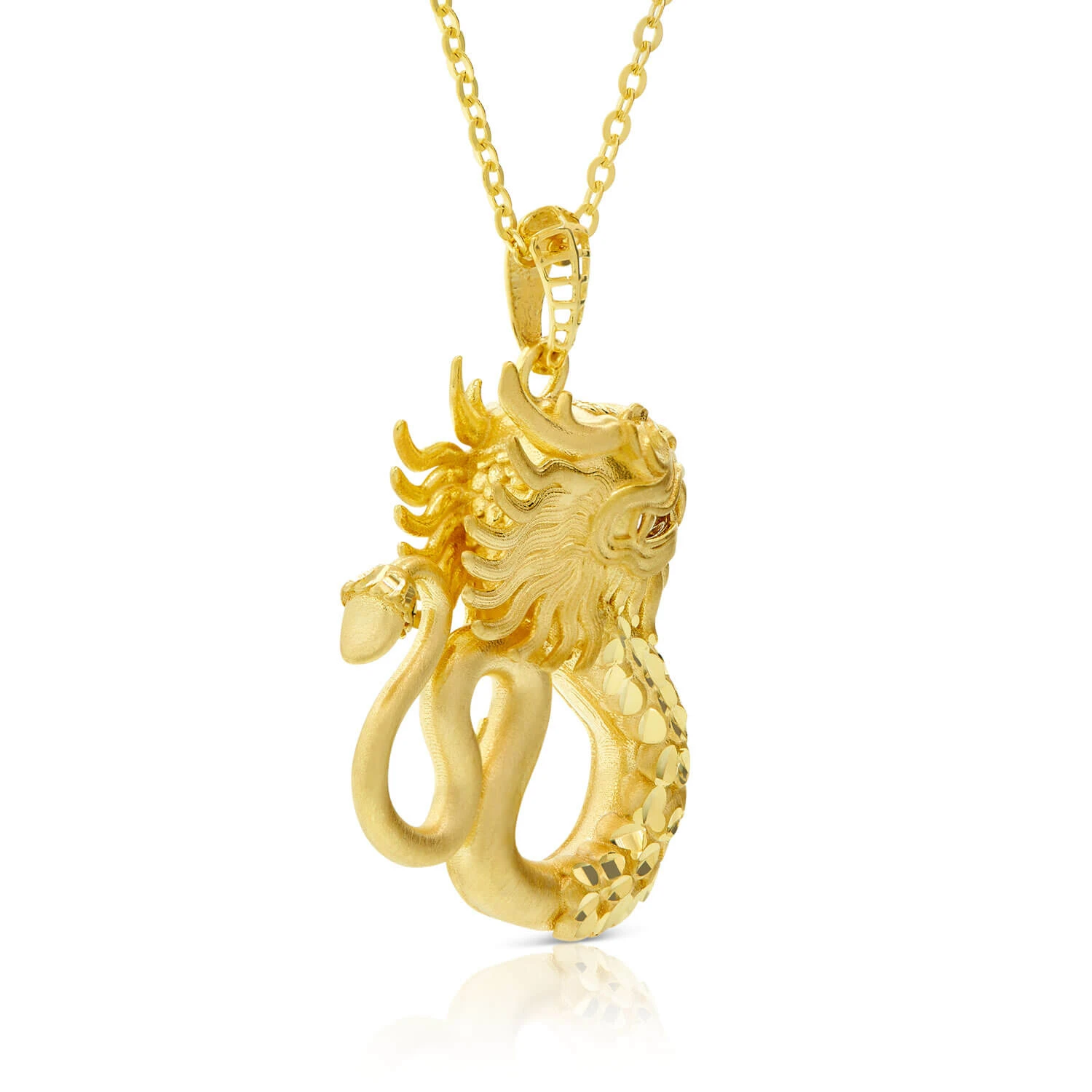 Nothing expresses power, wisdom, and the force of nature the way a dragon does. This gold scaled dragon pendant is the perfect way to reflect such resounding strength. As a gift, it can represent an offering of good luck and a guide to new knowledge. Pendant is approxiamtely 22mm x 27mm. Chain is 17 inches long with a sizing loop at 15 inches for shorter wear.