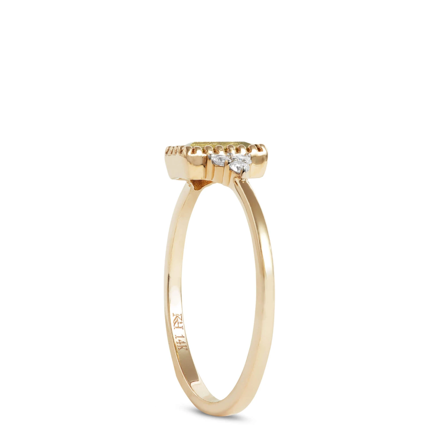 This charming 14k yellow gold emerald cut peridot and diamond ring has a delicate design. Its smaller size and understated design make it suitable for those who prefer dainty and subtle accessories.