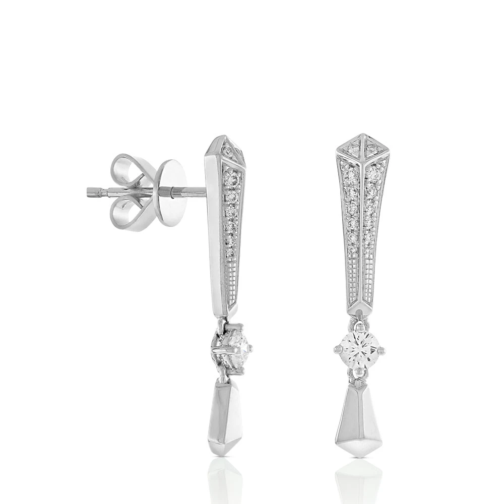 A Ben Bridge Signature Diamond pulls together two stylized shapes, one adorned with non-Signature diamonds, the other shining with a high polish finish. The Ben Bridge Signature diamond and the lower shape both move freely for a pair of earrings that move to add sparkle to your every step. Earrings are approximately 22mm long.