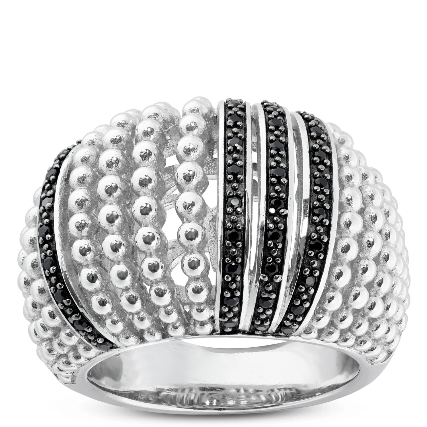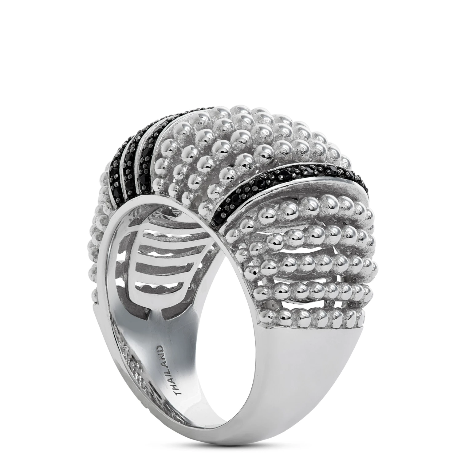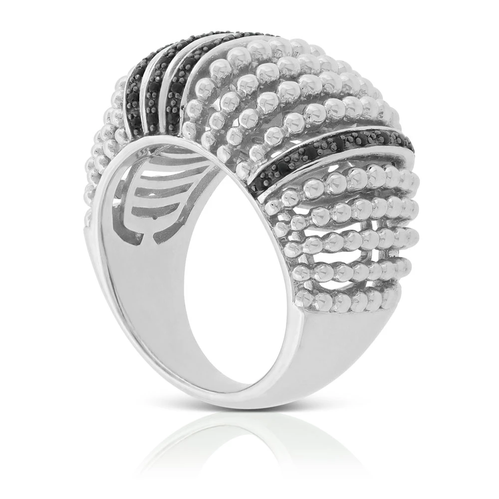 Four rows of black sapphire interspersed with beaded lines form a domed shape reminiscent of a dark anemone. Head of ring is approximately 17mm wide, tapers to 5mm at the back.