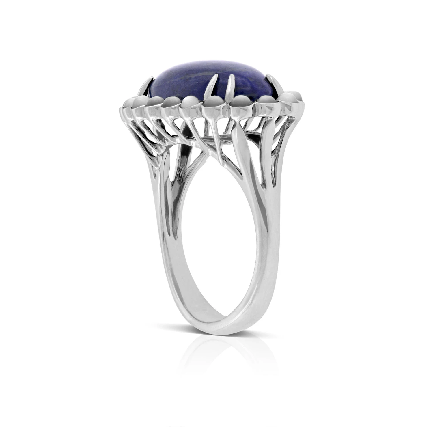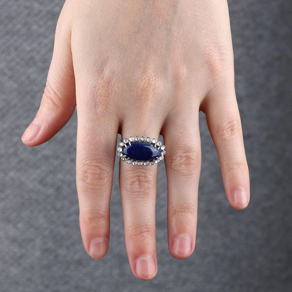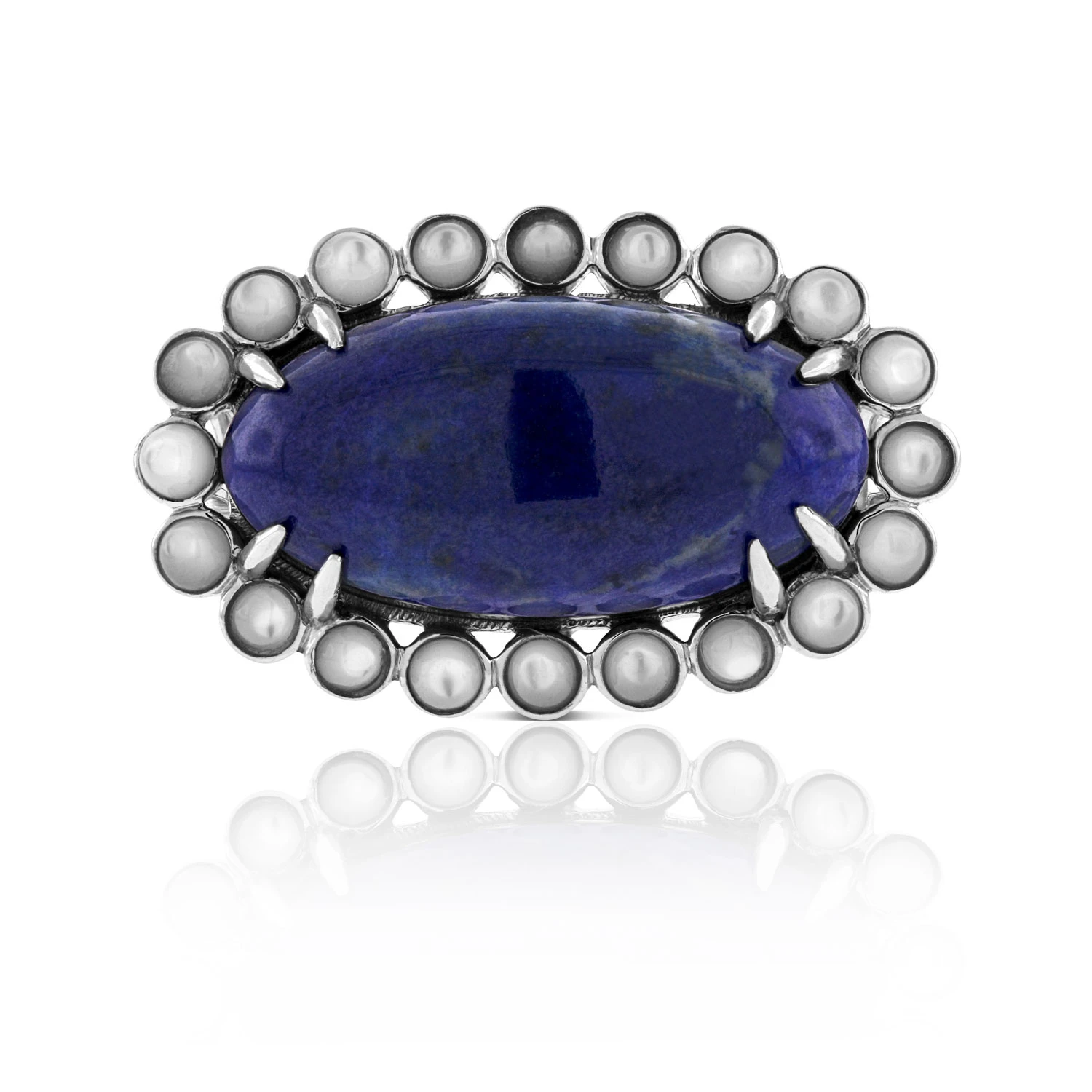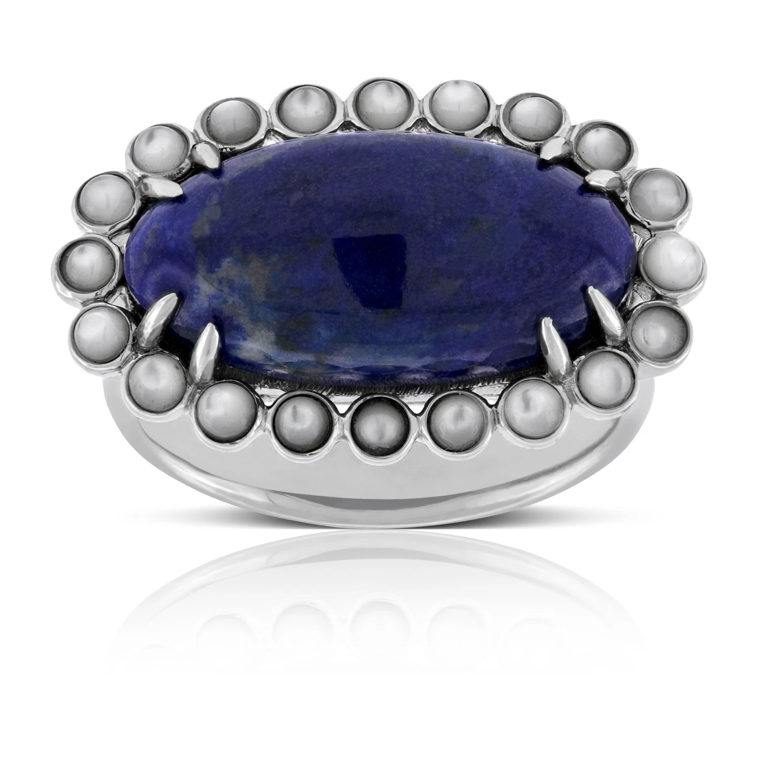 Fashion forward ring features a lapis lazuli gemstone framed with a halo of mother of pearls in sterling silver.
