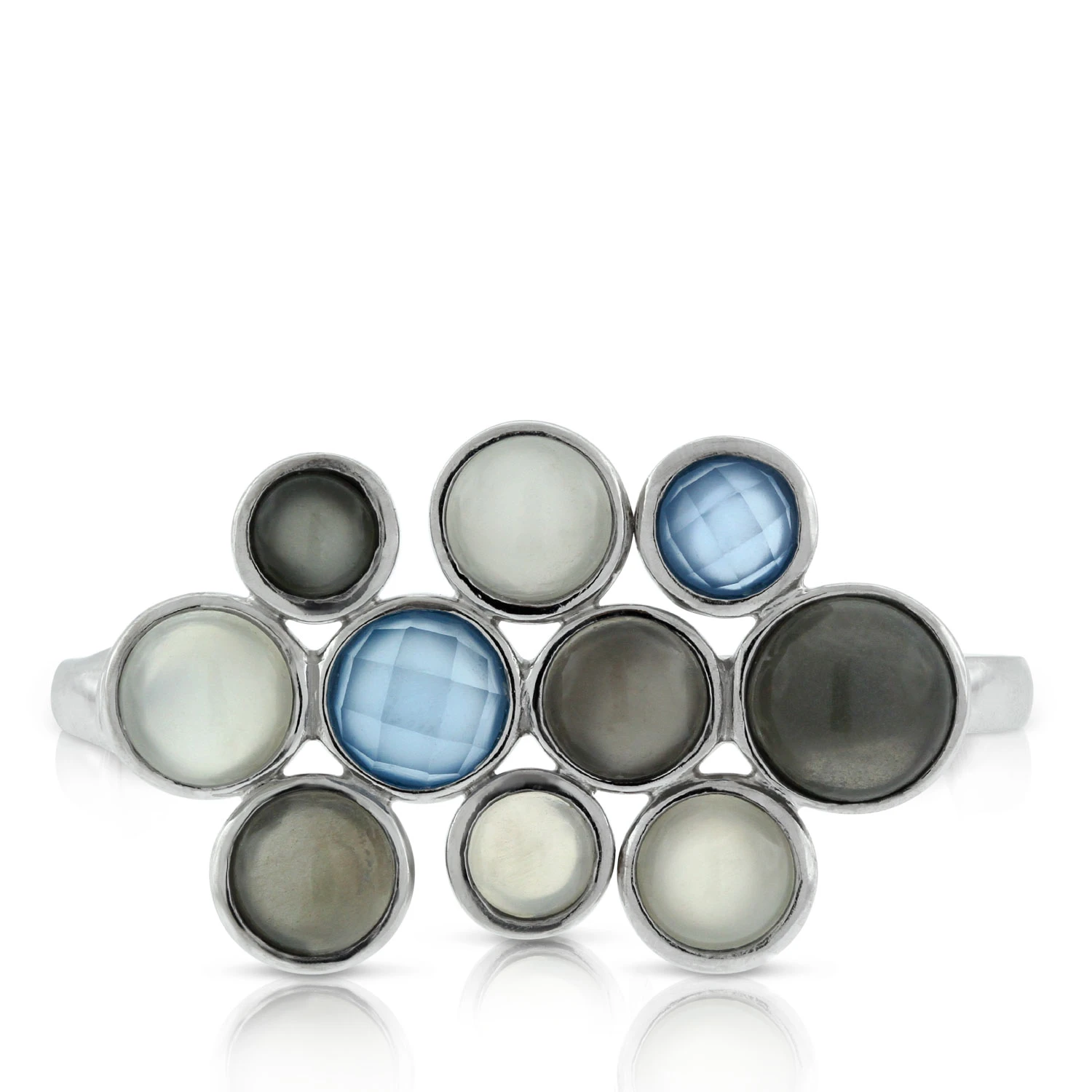 Lisa Bridge gray and white moonstone bubble double-finger ring with faceted dyed blue chalcedony, set in sterling silver. Inspired by sea foam carried to shore on the crest of waves, this fashion-forward geometric ring is designed to be worn over two fingers for a stylish statement in soft, cool hues. Ring is a size 7 with one adjustable silver band.