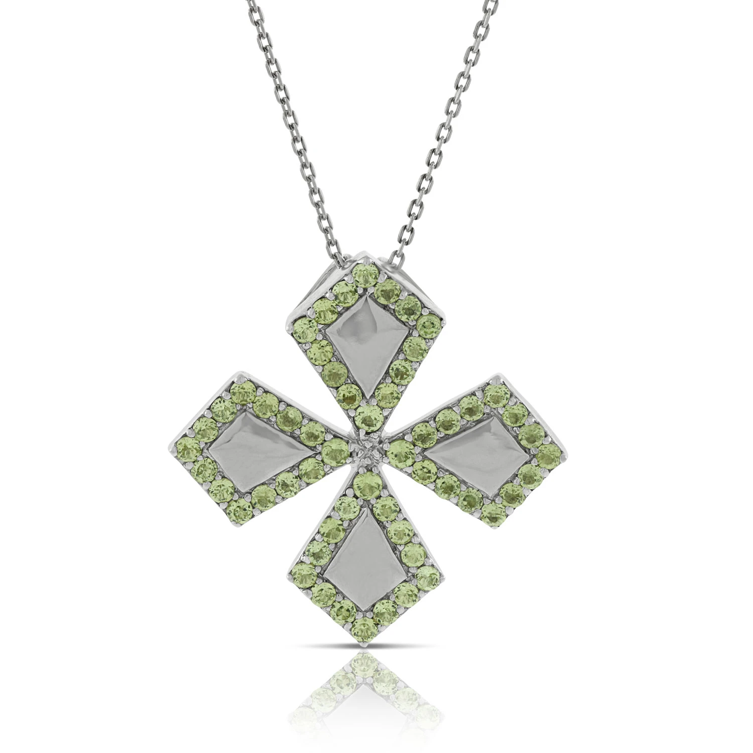 Peridot gemstone flower motif pendant in sterling silver, approximately 1.25 inches long. Delicate 18 inch chain included.