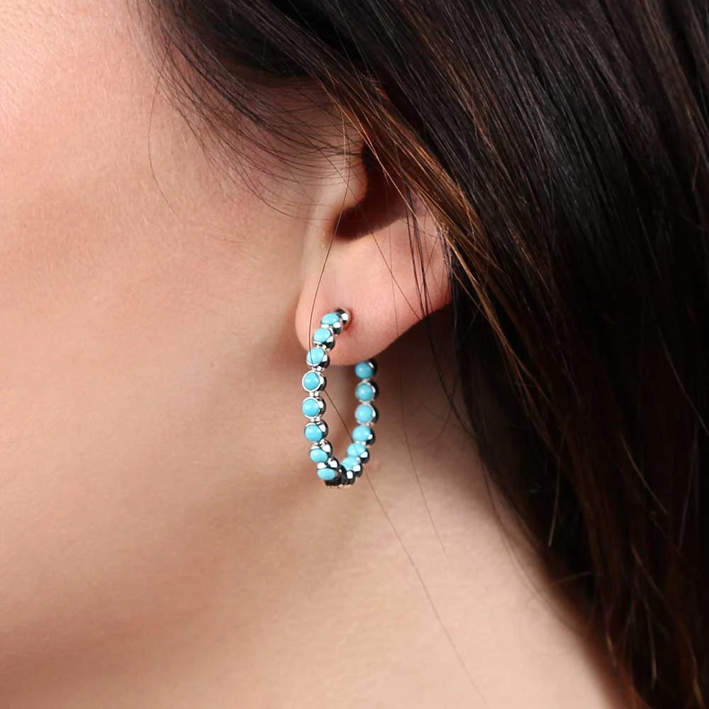 Cabochon cut turquoise gemstones set off these fashion forward sterling silver hoop earrings. Unique in and out design with gems inside the back part of the earring for enhanced visibility while worn. Hinged at bottom of hoop for easy on / off wear. Part of the Peru Collection by Lisa Bridge, this piece captures the beauty of the Peruvian culture and brings a vibrant bright color of South America into your life.