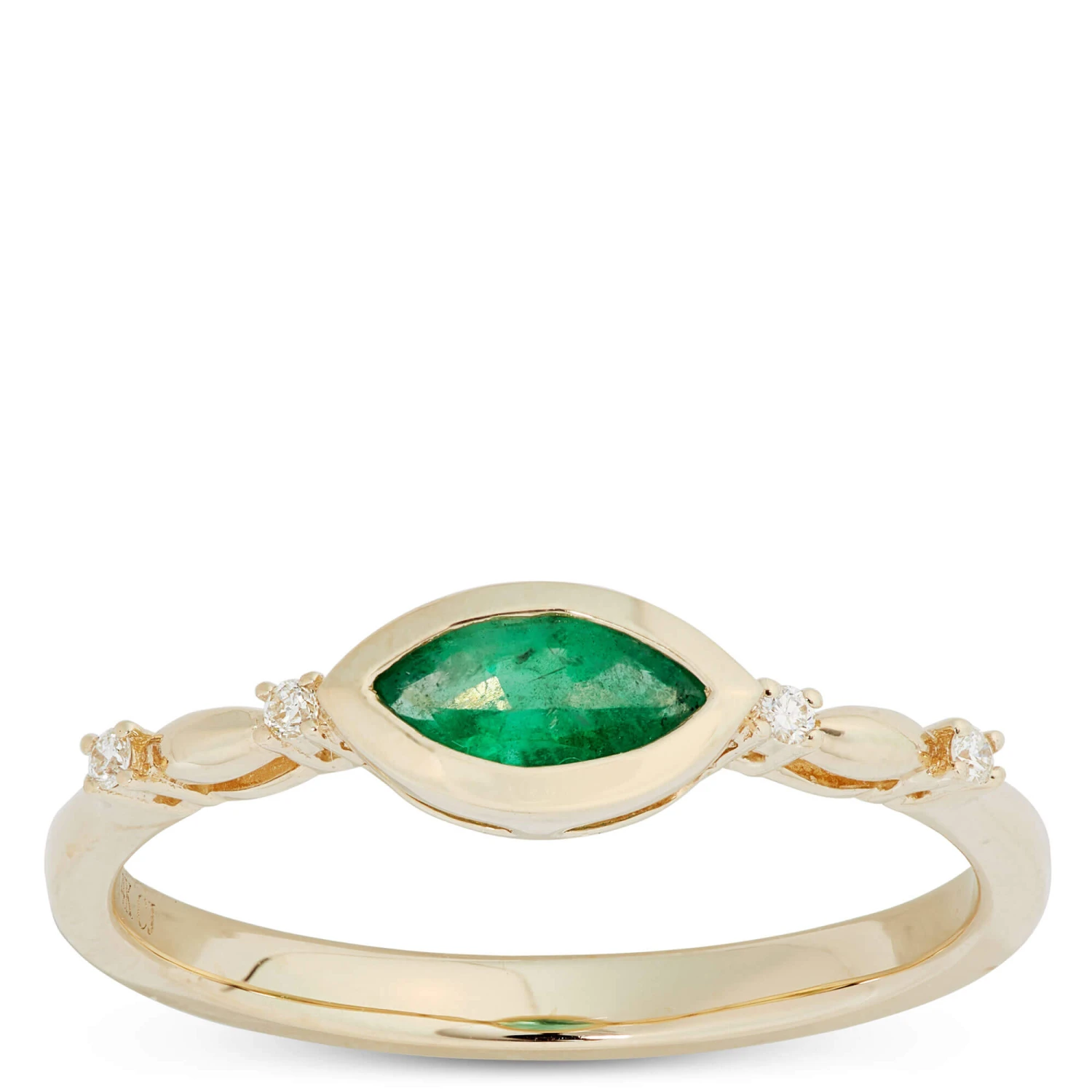 Only the forces of nature can create a stunning emerald centerpiece like this one. The deep green emerald is an intriguing, eye-shaped marquise cut that’s set in a classically stylish 14k yellow gold. Round cut accent diamonds add the perfect sparkle for a ring that’s ready for any occasion.