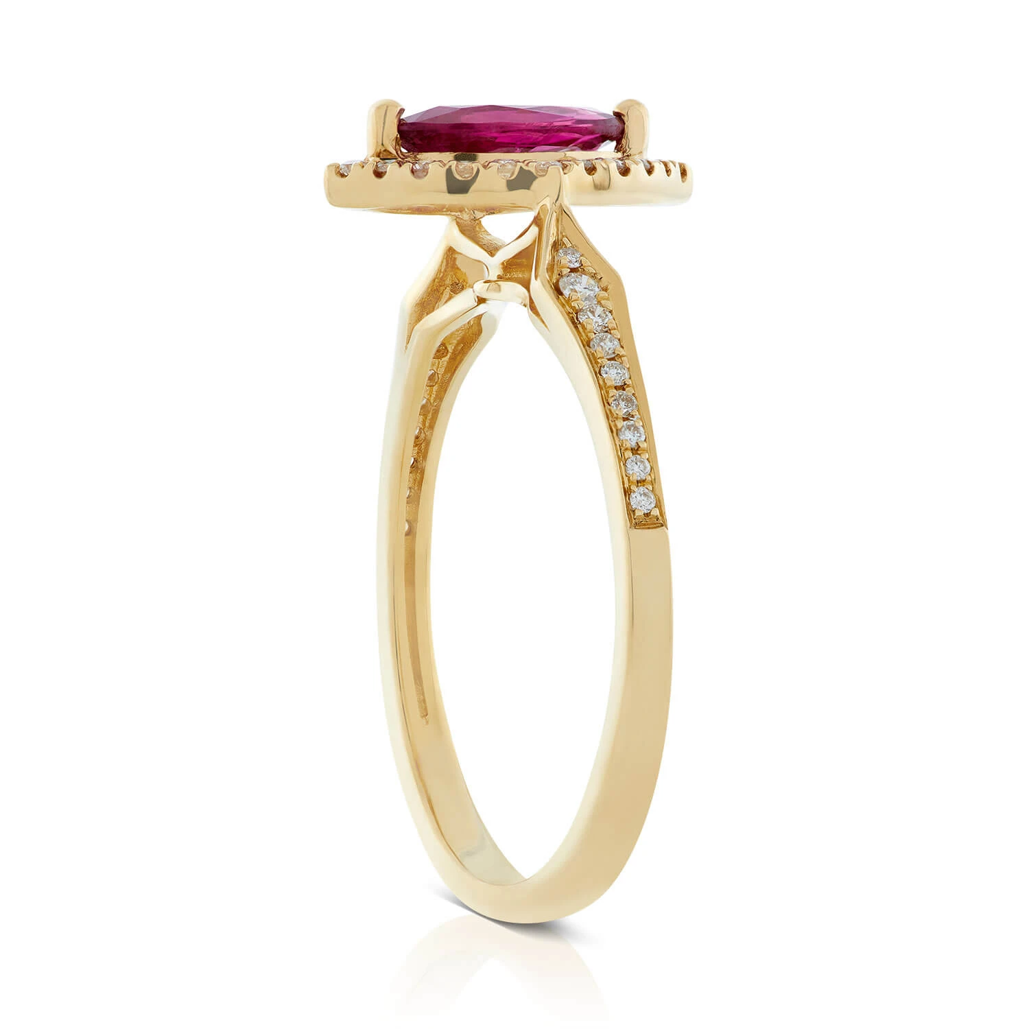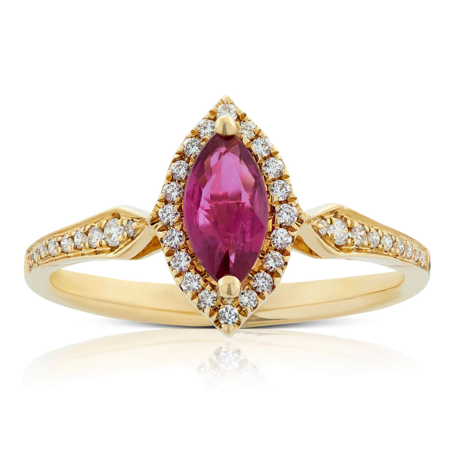 Gently graduating diamonds leads to a diamond halo holding a marquise cut ruby for a stunning modern gemstone ring. Head of ring is approximately 8 x 12mm. Band is approximately 2mm.