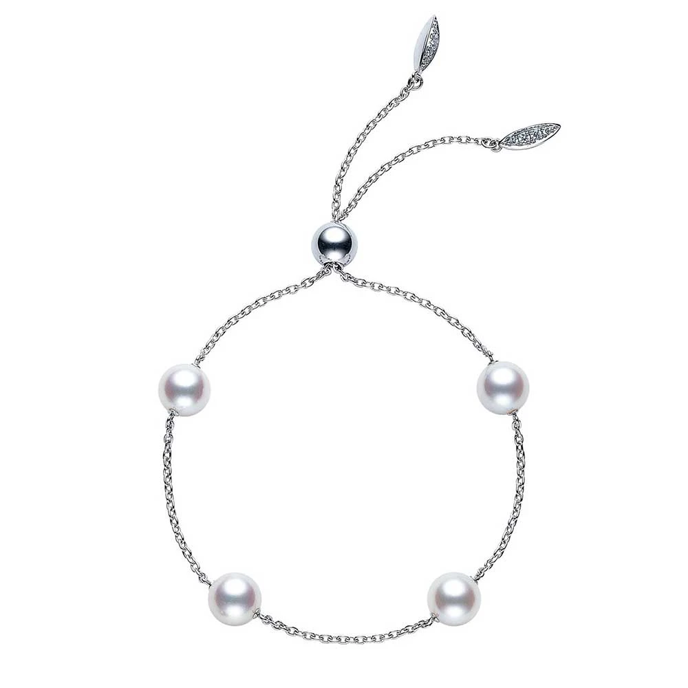 A fine white gold chain is interrupted by lustrous cultured Akoya pearls in this tin cup style bolo bracelet. Diamonds accent the marquise shaped aglet endings.