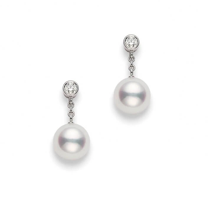 MIKIMOTO Akoya cultured pearl and diamond drop earrings. Pearls are 8 to 8.5mm, A+, with .16 diamond carat total weight set in 18k white gold.