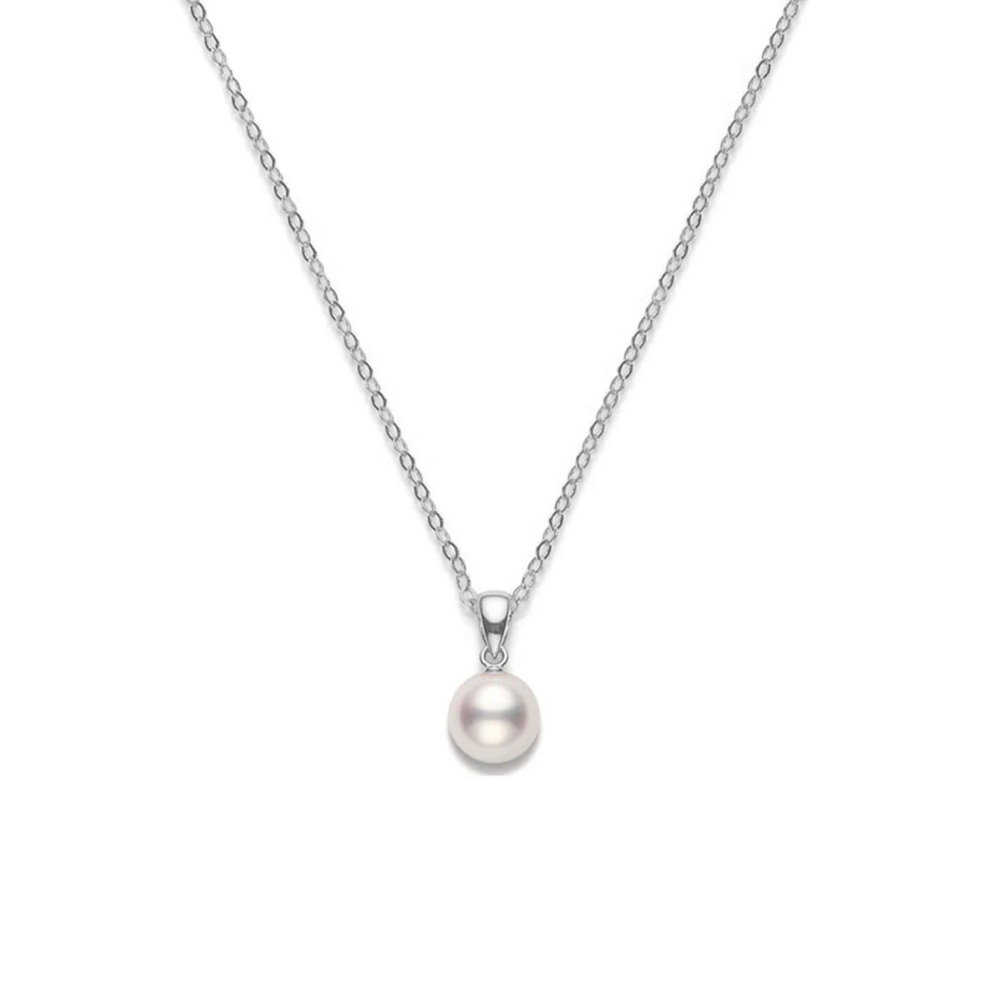 MIKIMOTO Akoya cultured pearl pendant. Pearl is 6-6.5mm, AA quality set in 18K white gold. Delicate 18 inch chain included.