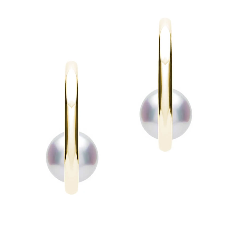 A lustrous Akoya cultured pearl sits elegantly inside a small open hoop for a modern floating pearl design.