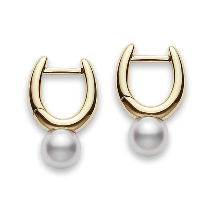 A lustrous cultured Akoya pearl rests below a small, sleek yellow gold hoop.