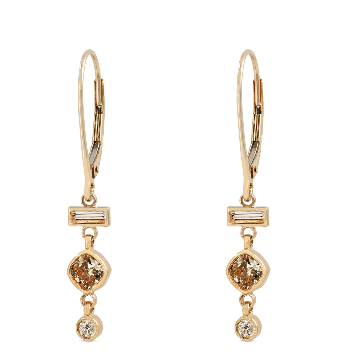 These cluster diamond earrings are made for your big moments with three mix shaped diamonds. Two of those diamonds are natural brown diamonds that showcase magnificent depth and intriguing color while the white diamond shines with its classic sparkle. Each stone is set in classically elegant 14k yellow gold.