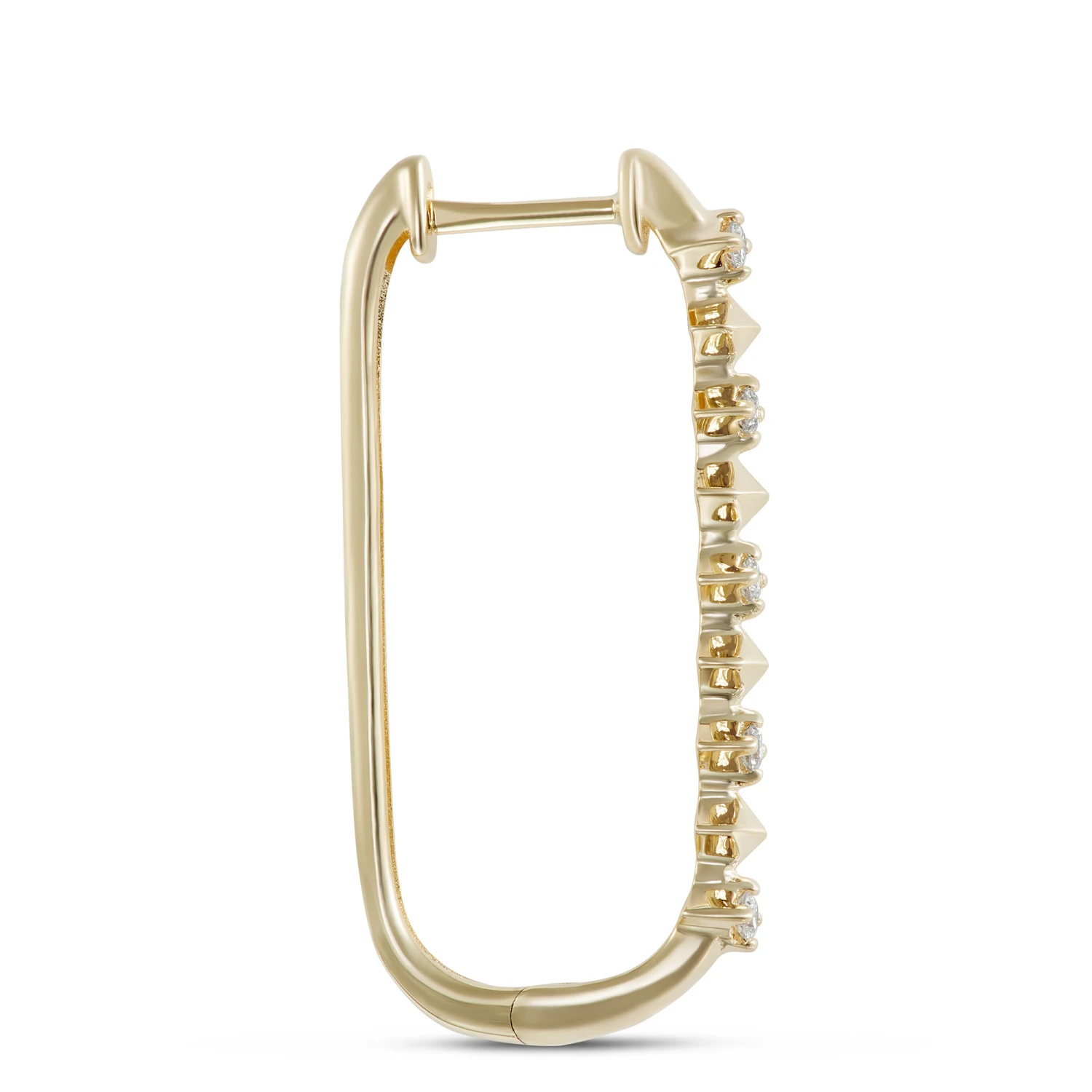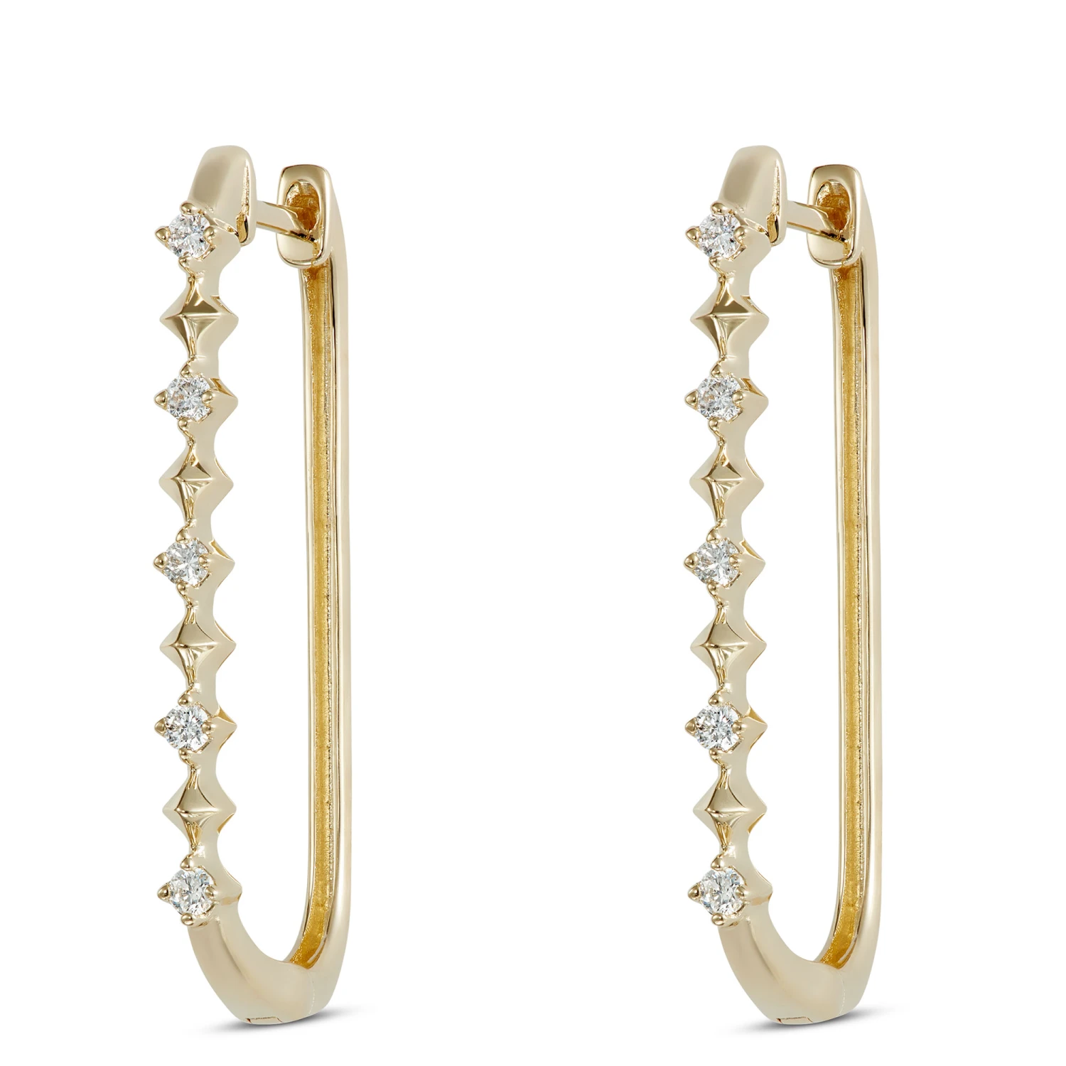 These oval shaped hoops bring just the right amount of edge with sharp, angular lines that contrast with smooth contours. Round diamonds add just the right glint of sparkle. These are extraordinary everyday earrings that are sure to become a go-to staple of your jewelry wardrobe.