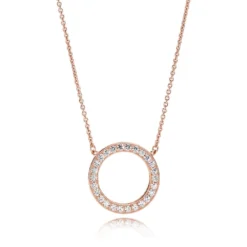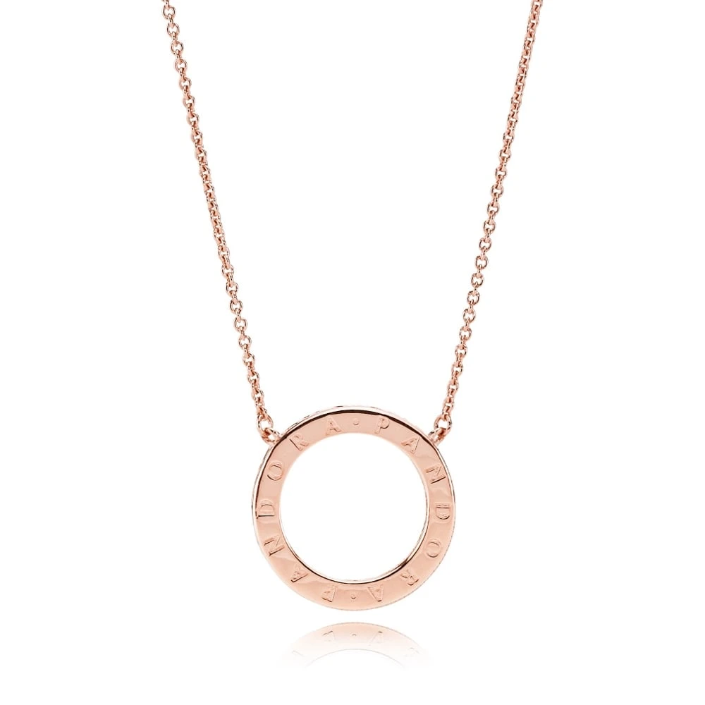 Bring your outfit full circle with this 14K rose gold-plated Circle of Sparkle Necklace. The reversible pendant is framed with shimmering cubic zirconia on one side, and embossed with the Pandora logo on the reverse โ enabling you to create two different looks. The lobster clasp and jump ring are made from sterling silver plated with 14K rose gold. For extra versatility, the delicate chain is adjustable to three different lengths. Pair this circle necklace with the matching Circle of Sparkle Earrings for maximum glamour.