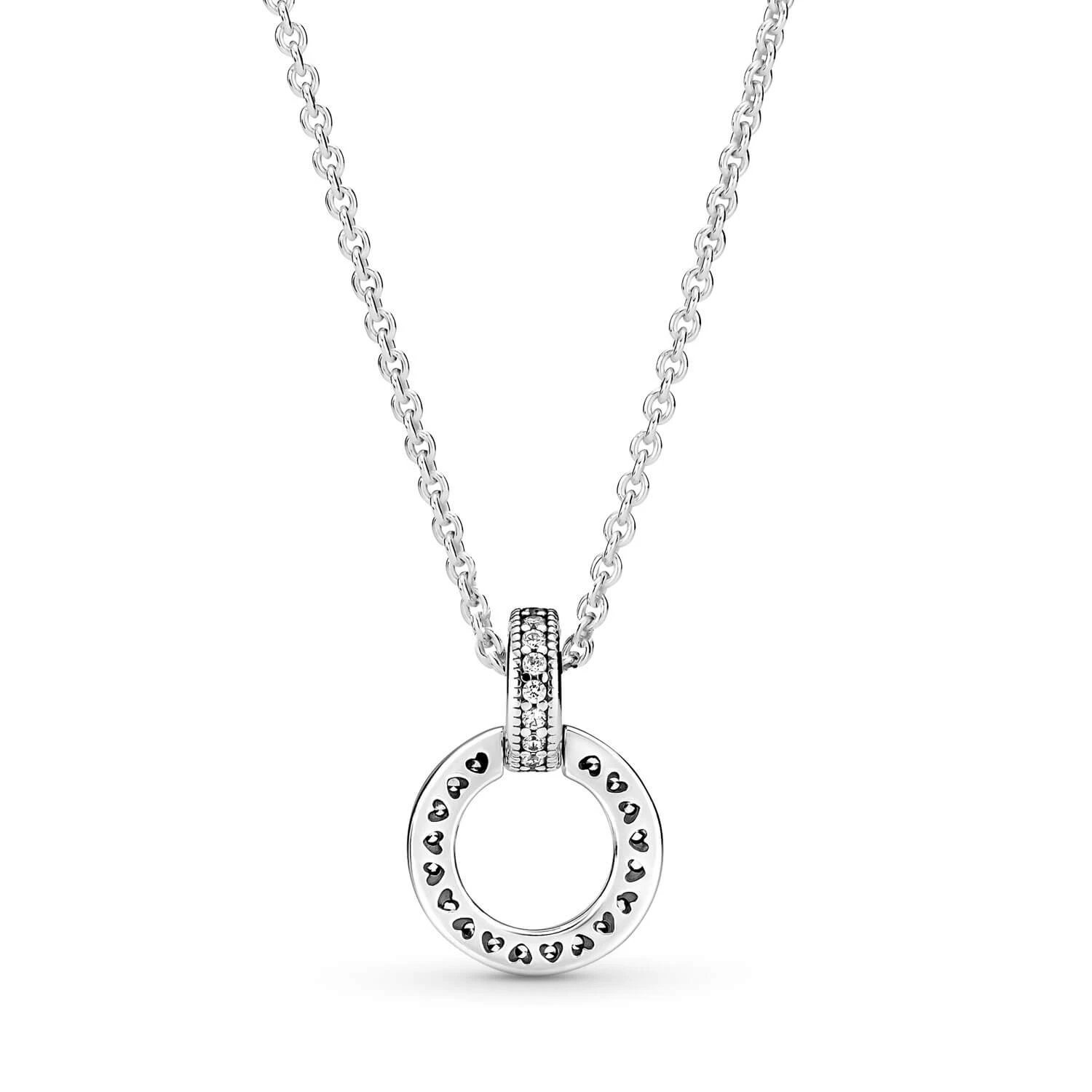 Make a statement with the Double Circle Pendant and Necklace. This sterling silver necklace features two circles merged to form a pendant. The top circle includes a row of clear cubic zirconia pavé along the edge and the Pandora logo on one side. The bottom circle swings back and forth from the top circle and features clear cubic zirconia pavé on one side and cut-out hearts on the other. Turn the necklace to switch up your look.