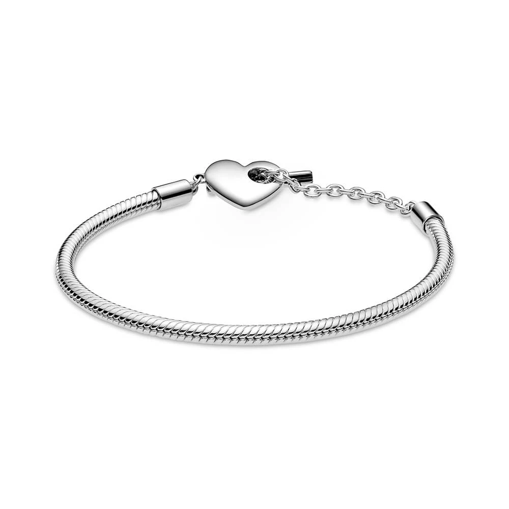 Add a personalized touch to your loved one’s collection with the Pandora Moments Heart T-Bar Snake Chain Bracelet. Hand-finished in sterling silver, this piece is inspired by the classic Pandora Moments T-bar snake chain bracelet. The style features a heart-shaped disc with an open circle on one side to loop the T-bar through to open and close, while the reverse polished side is engravable. Designed to be styled with 10-13 charms, include a unique message for a heartfelt finish.