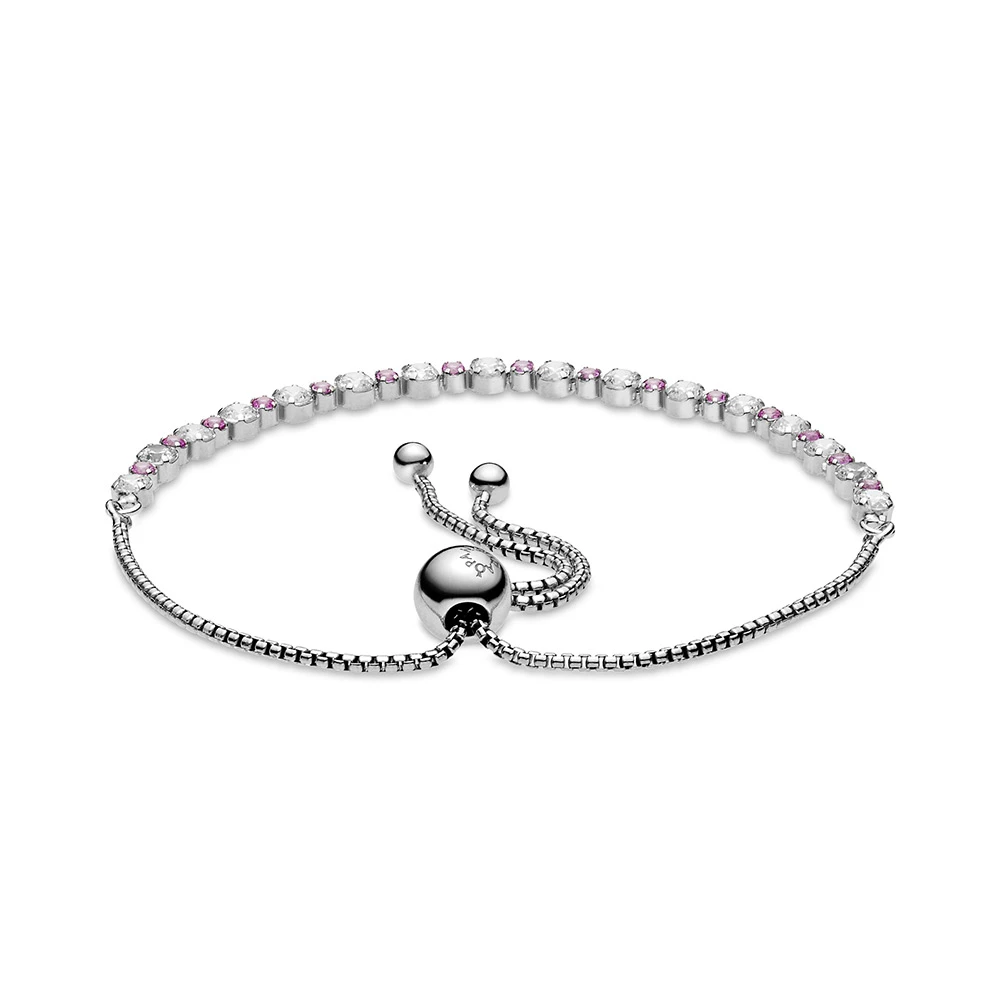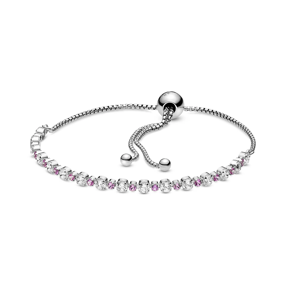 Add a sophisticated pink note to your look with this sparkling sterling silver slider bracelet. Hand-finished with two tones of shimmering details, this tennis bracelet features clear cubic zirconia and pink synthetic sapphires in alternating sizes, adding a layer of contrast to the piece. The bracelet features a handy adjustable slider clasp for a perfect fit. Add a classic and versatile staple to your collection and wear this stylish piece years to come.