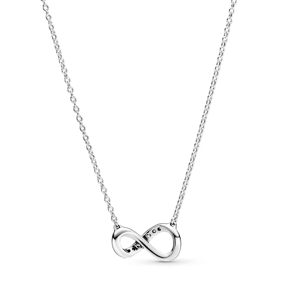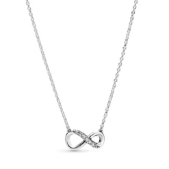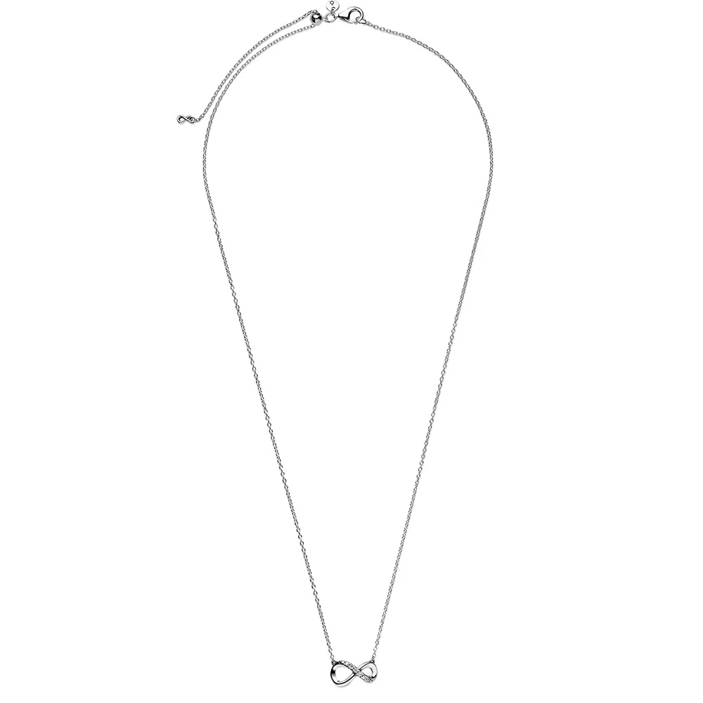 The delicate infinity collier necklace symbolizes love that lasts for all eternity. It dazzles in sterling silver and features clear cubic zirconia for added sparkle. Inspired by the eternal bond between a mother and a child, the infinity symbol lends gravitas to your emotions and helps you express exactly how you feel with a universally recognized sign for a deep connection. Style with other infinity-inspired pieces or gift the eternity necklace to someone you love to infinity and beyond.