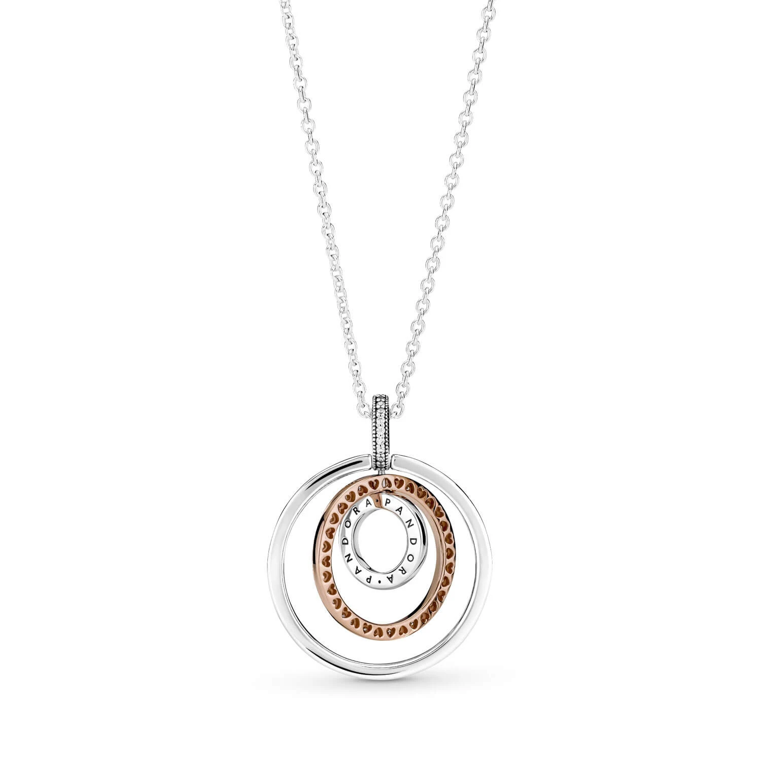 Go geometric with the Two-tone Circles Pendant & Necklace. Hand-finished in sterling silver and 14K rose gold-plating, this necklace features three spinning circles. The outer circle includes Pandora logos on one side and the other side is polished; the 14K rose gold-plated middle circle features clear cubic zirconia pavé framed by micro-beading on one side and cut-out hearts on the other; the center circle has pavé framed by micro-beading on one side and a Pandora logo on the reverse. The circles can be turned for eight different styling combinations.