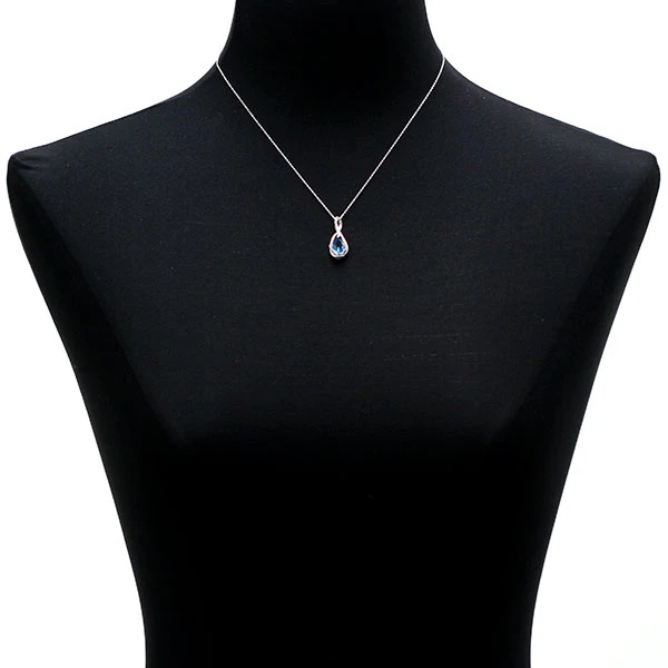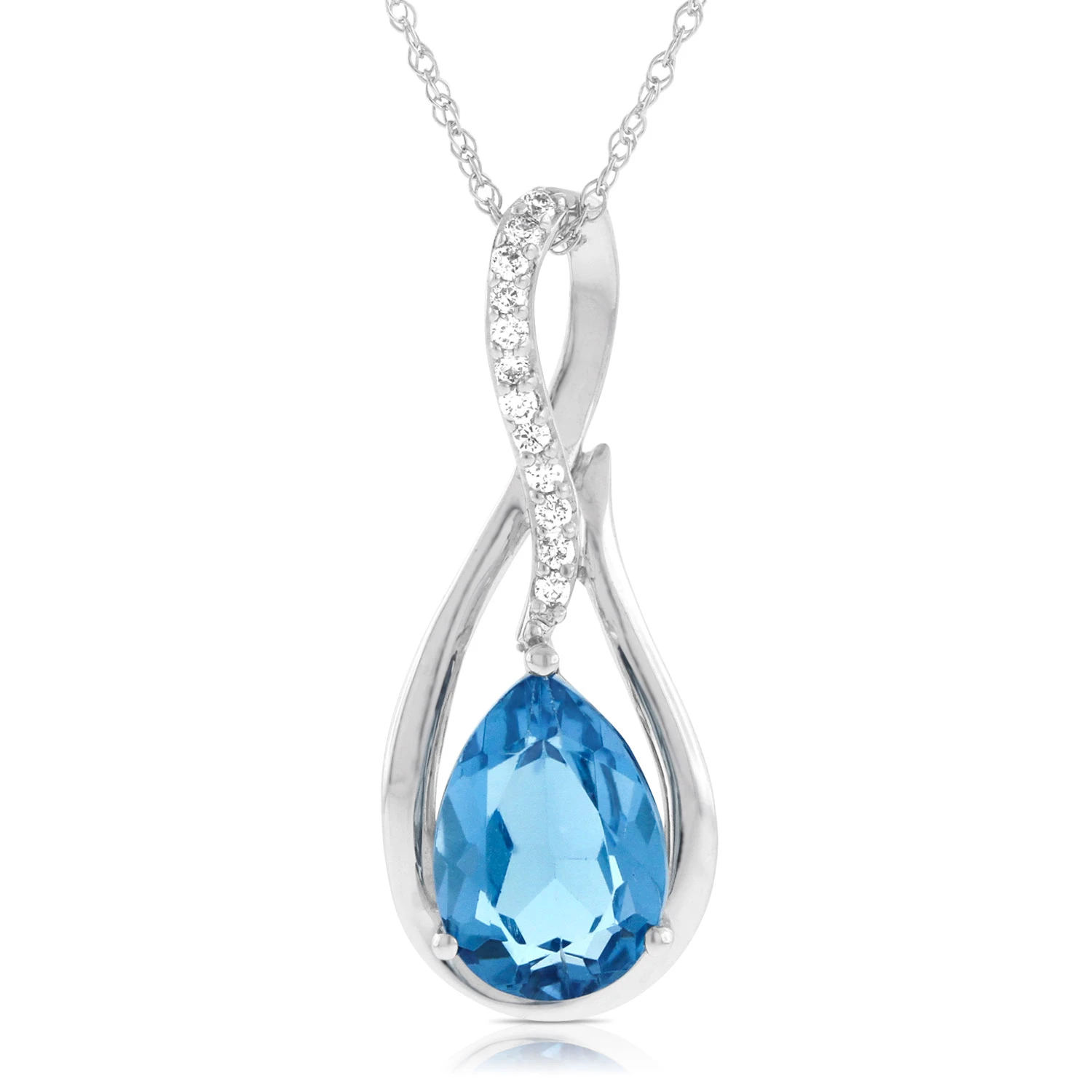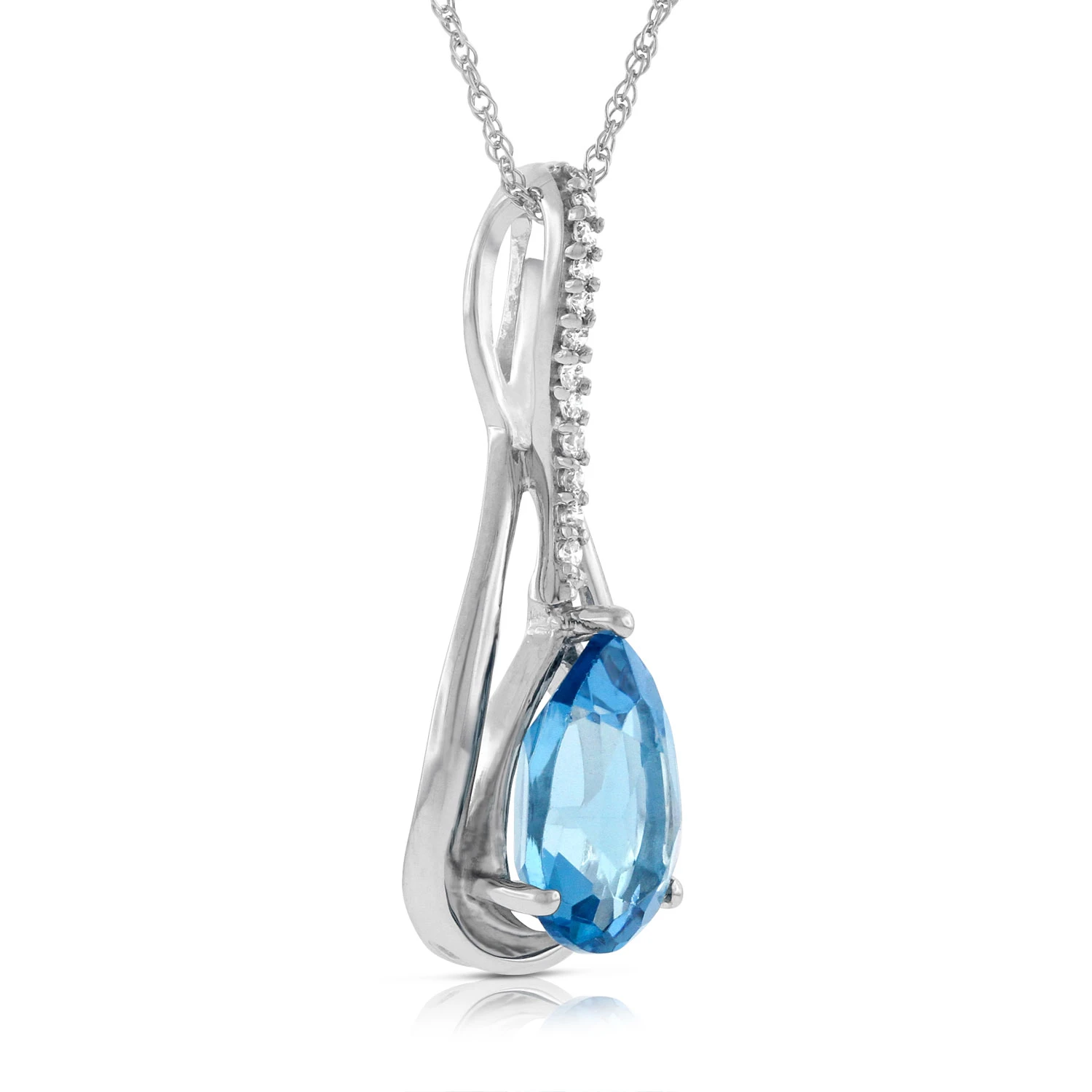 Pear shaped blue topaz pendant with a cascading wave of diamonds in 14K white gold. Diamonds equal 1/15 carat total weight, delicate 18″ chain included.