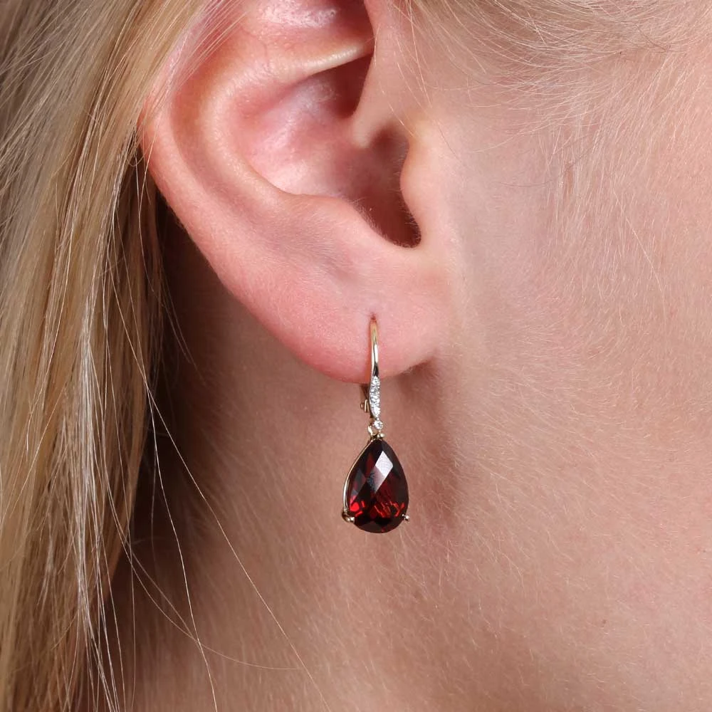 A beautiful pear shaped garnet dangles beneath a line of diamonds to give you a bold feminine earring design. Approximately 28mm long.