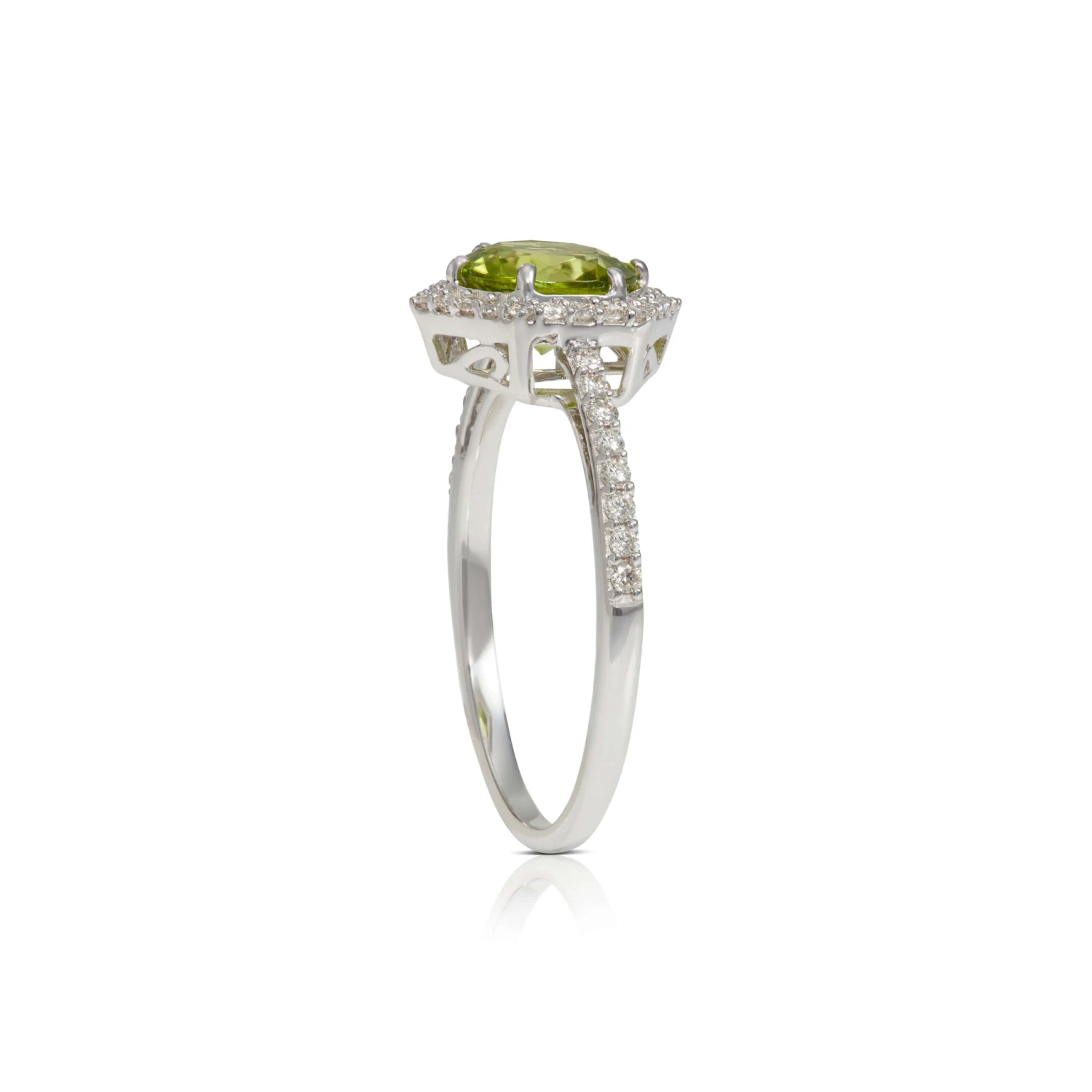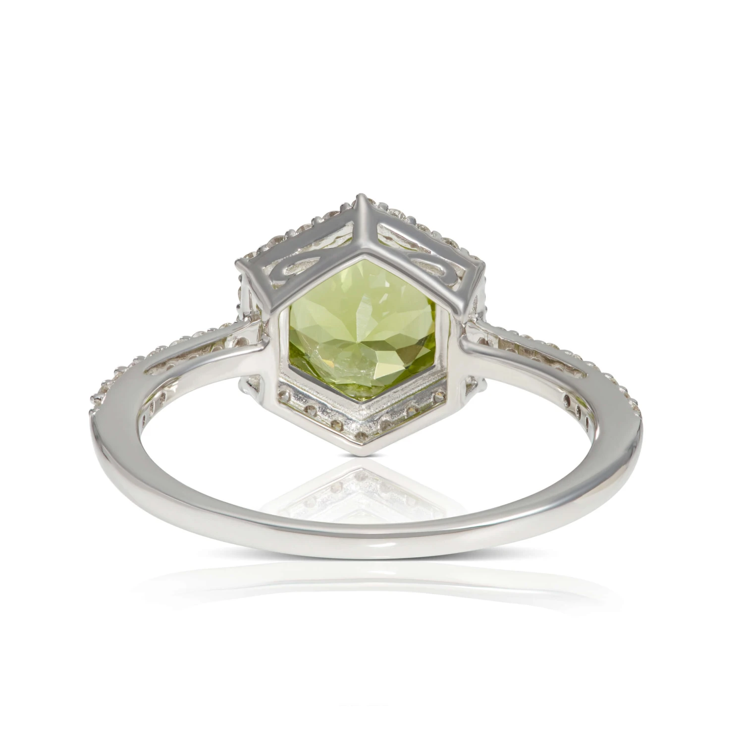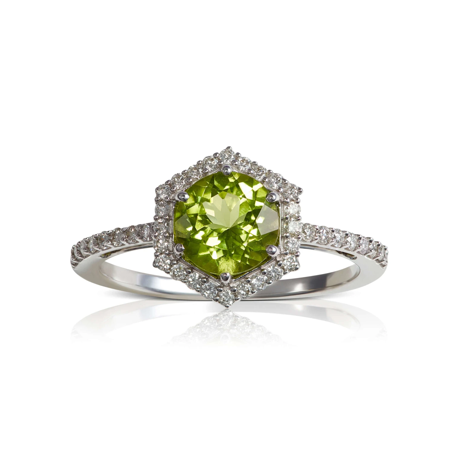 A diamond accented band presents a round peridot within a hexagonal shaped halo of round diamonds for a simlpy sweet geometric ring. Head of the ring is approximately 9 x 9mm. Band is approximately 1mm wide.