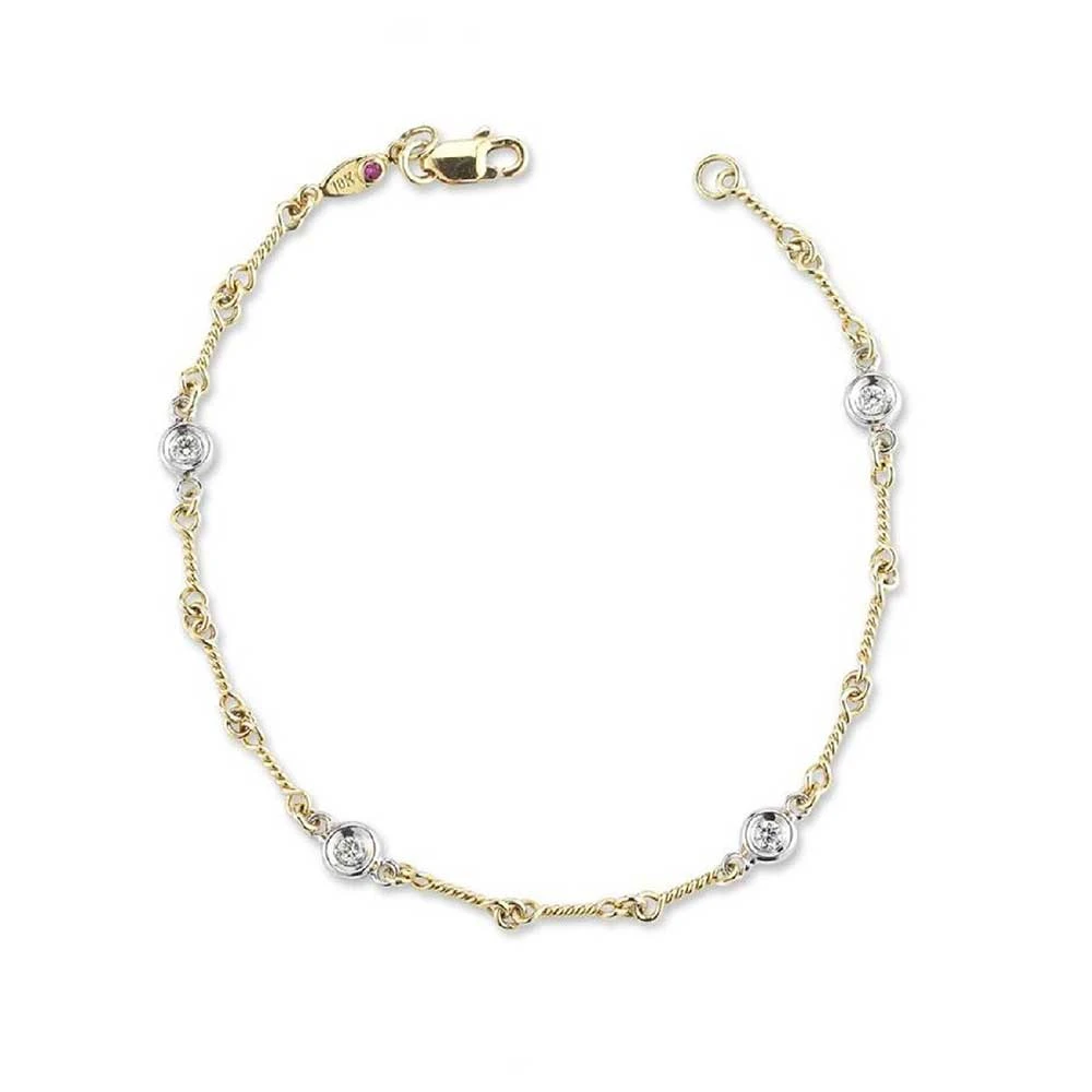 Diamonds are emphasized inside a white gold bezel setting, along a dogbone style yellow gold chain. The Diamonds by the Inch collection, known for bezel set diamonds along delicate chains, encourages you to make your own look. Wear pieces on their own for a light, feminine feel, or layer them to for a fresh look.