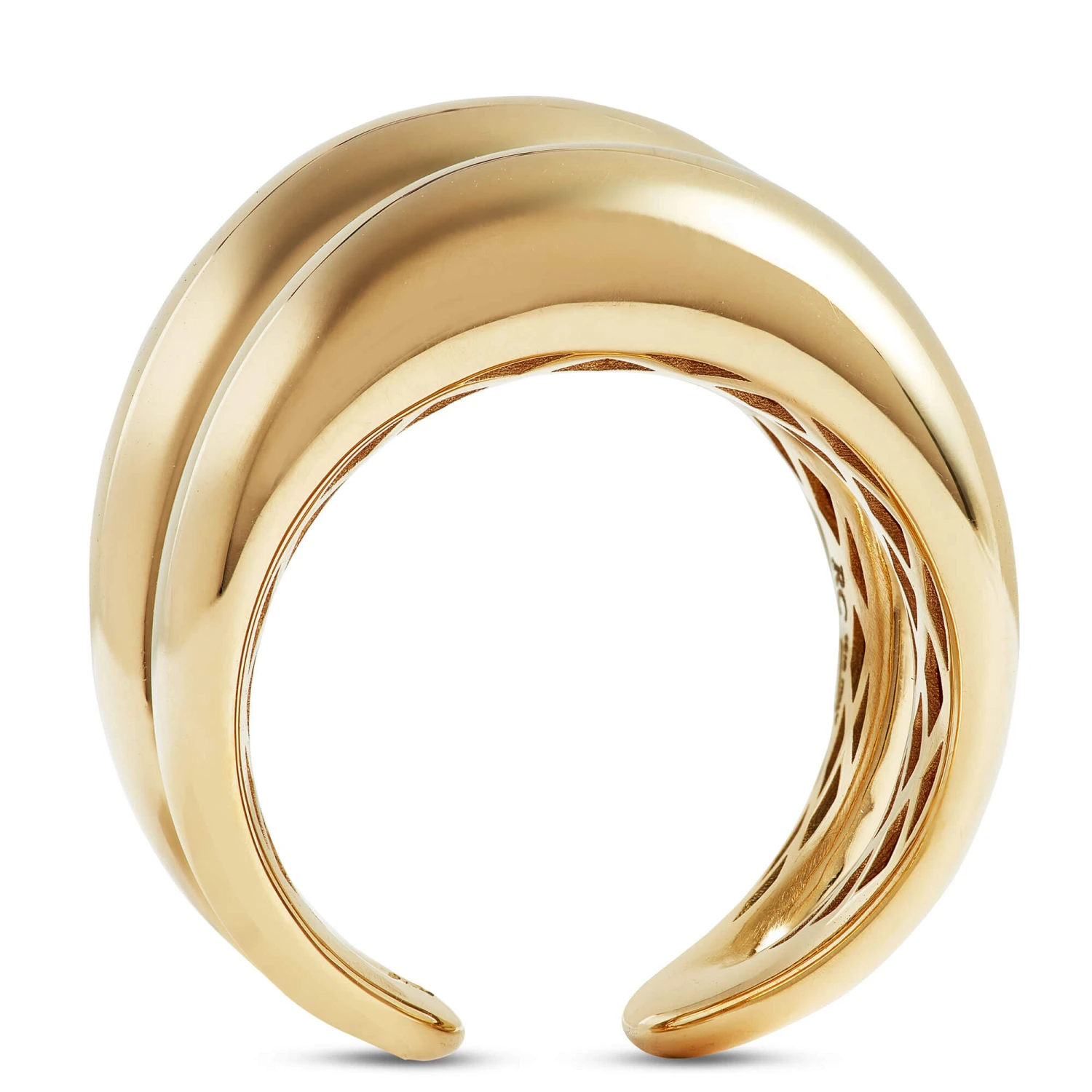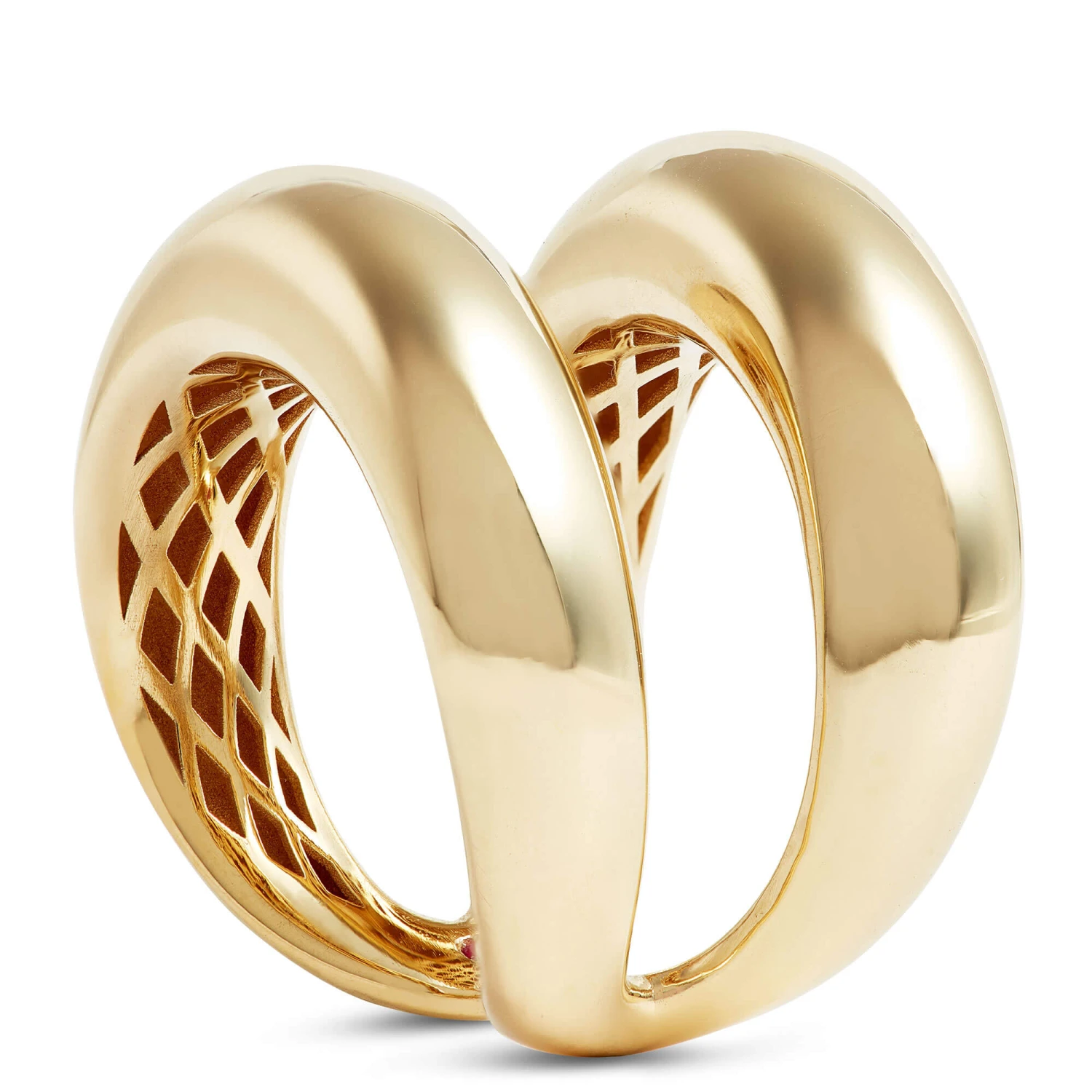 Exquisite artistry and stunning 18k yellow gold make this Roberto Coin Oro Classic ring a true statement piece for gold lovers. The flowing design and open back provide a look of liquidity that showcases the expert shaping of every curve and detail. Two big, beautiful bands of gold melt into each other with harmony and symmetry for a piece that is truly an example of wearable fine art. Due to the unique nature of this ring it is a size 6.5 and cannot be resized.