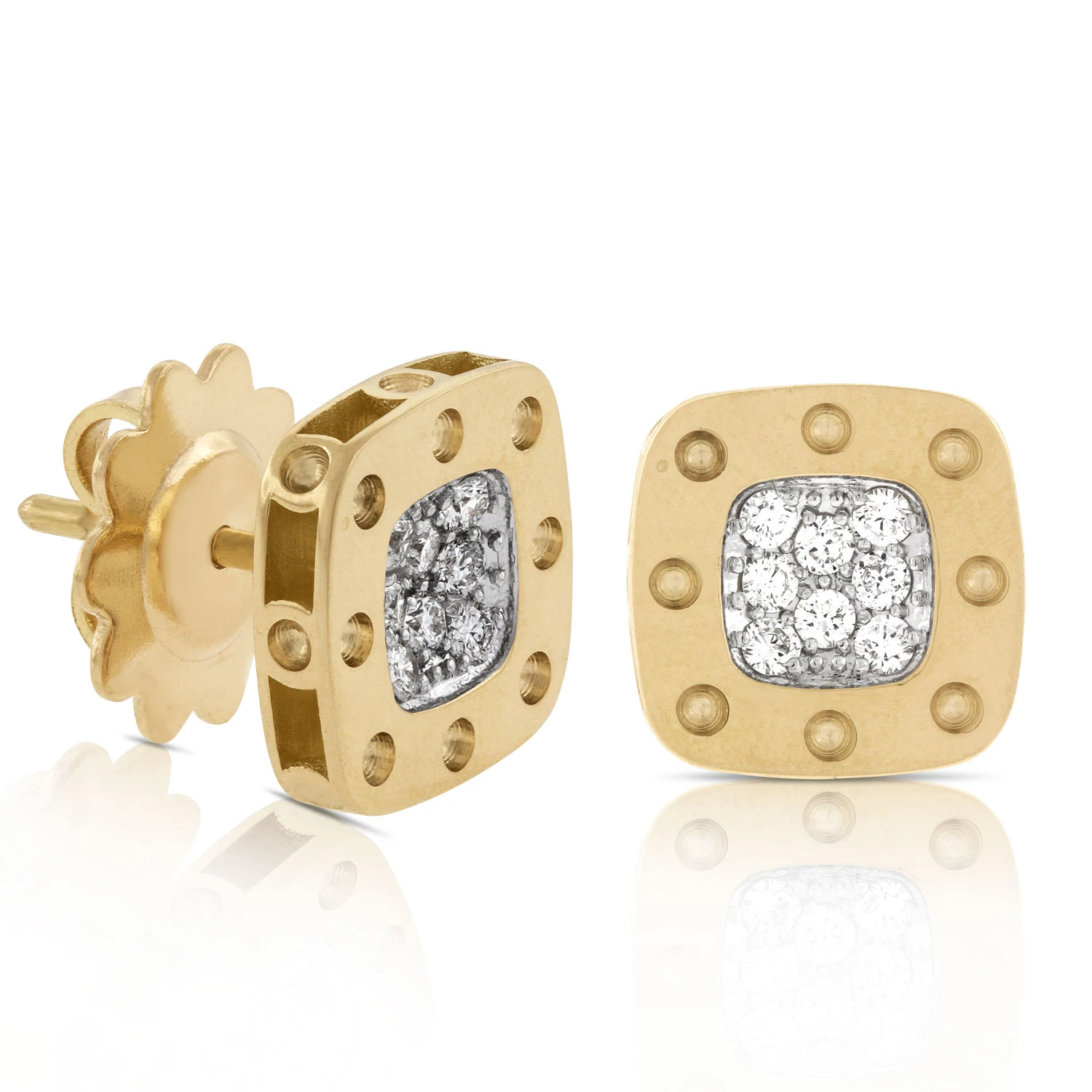 Brushed metal divots are etched along the edge of a high polished yelllow gold square that surrounds a cluster of diamonds in each stud. The Pois Moi collection features bold, yet delicate designs that create a classic, yet contemporary feel.