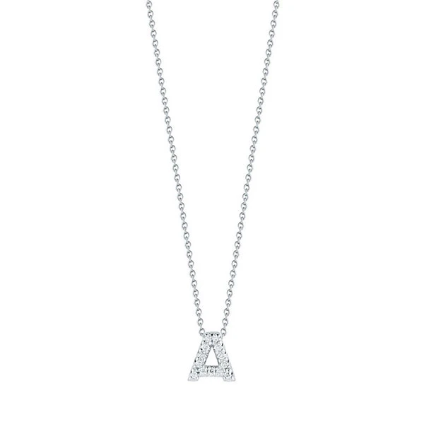 Roberto Coin Love Letter diamond pendant ‘A’, set in 18K white gold. Letter measures approximately 7mm tall. Delicate 18″ chain included, adjustable to 16″. The Tiny Treasures collection features fanciful diamond jewelry for every personality.