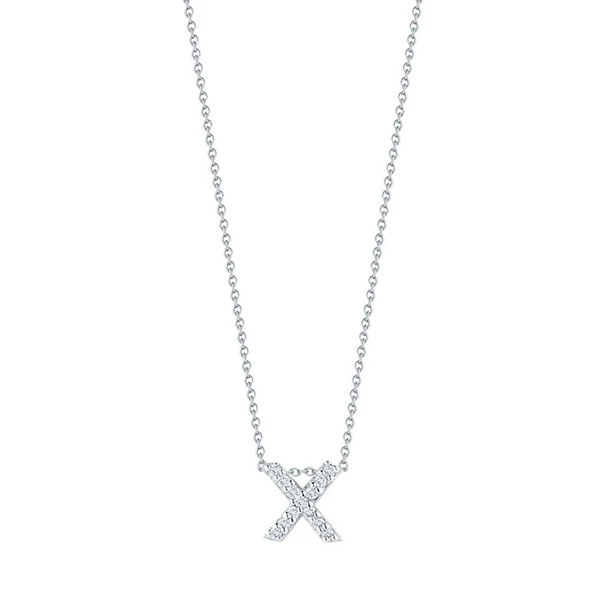Roberto Coin Love Letter diamond pendant ‘X’, set in 18K white gold. Letter measures approximately 7mm tall. Delicate 18″ chain included, adjustable to 16″. The Tiny Treasures collection features fanciful diamond jewelry for every personality.