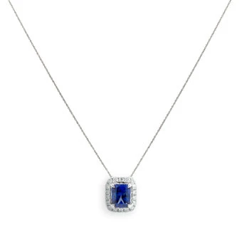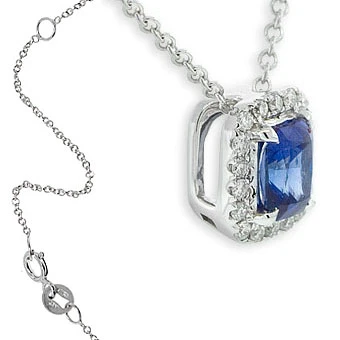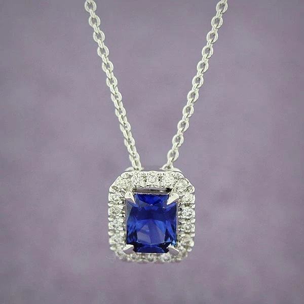 Radiant cut sapphire pendant with 1/10 carat total weight of diamonds, in 14K white gold. Delicate 18 inch chain included.
