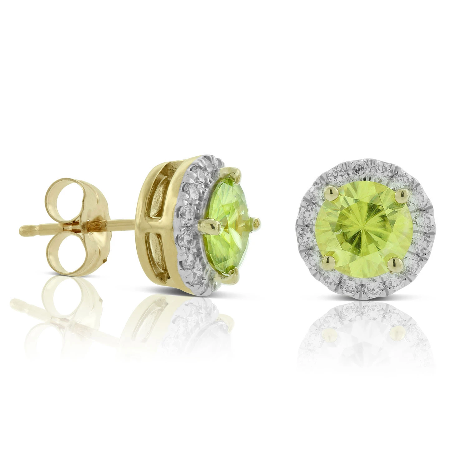 Bright sphene gemstones are showcased inside diamond halos to give you an easy colorful addition to any ensemble.