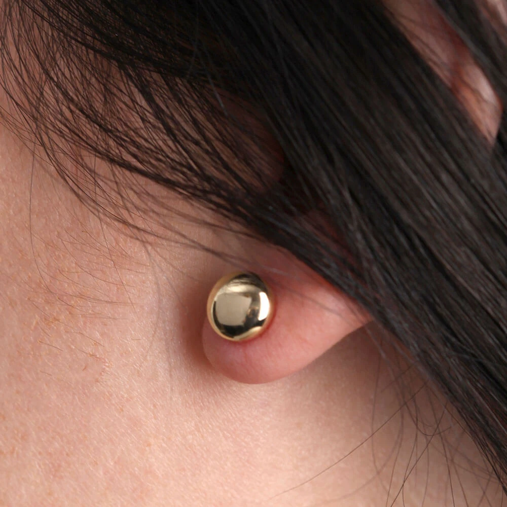 Button style stud earrings in 14K yellow gold. Earrings measure 8mm in diameter and are finished to a high polish.